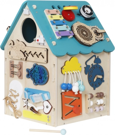 Ontdek de magie van spelenderwijs leren met dit interactieve Montessori-huisje in turkooise kleur van 2Kids Toys. Het biedt kinderen veelzijdige activiteiten voor de ontwikkeling van fijne motoriek, logisch denken en oog-handcoördinatie. Je vindt hier slotjes en grendels met geheime deurtjes, een spinner, een draaibare kookwekker, schakelaars, een kleurrijk doolhof, een xylofoon met stokje en een klok – alles veilig uitgevoerd in hout.
