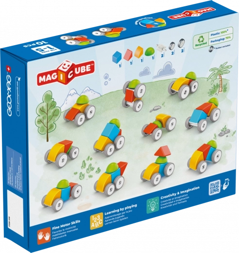 Ontdek de creatieve wereld met de magnetische bouwset GEOMAG Magicube auto met 10 delen – een veilige en leuke speelgoedset voor kinderen vanaf 1 jaar. Dankzij de magnetische vormen en de wielen met twee chassis bouwen kinderen gemakkelijk hun eerste autootje en ontwikkelen ze fijne motoriek, fantasie en coördinatie. Gemaakt in Zwitserland van gerecycled plastic.