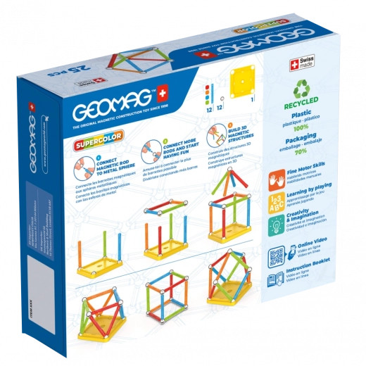 Ontdek de creatieve wereld met de magnetische bouwset GEOMAG Supercolor met 25 stukken – kleurrijke staafjes, stalen bolletjes en een vierkant voetstuk voor stabiele constructies. Alle kunststof onderdelen zijn gemaakt van 100% gerecycled materiaal, geproduceerd in Zwitserland. Inclusief een praktische opbergdoos voor eenvoudig meenemen. Geschikt voor kinderen vanaf 3 jaar.
