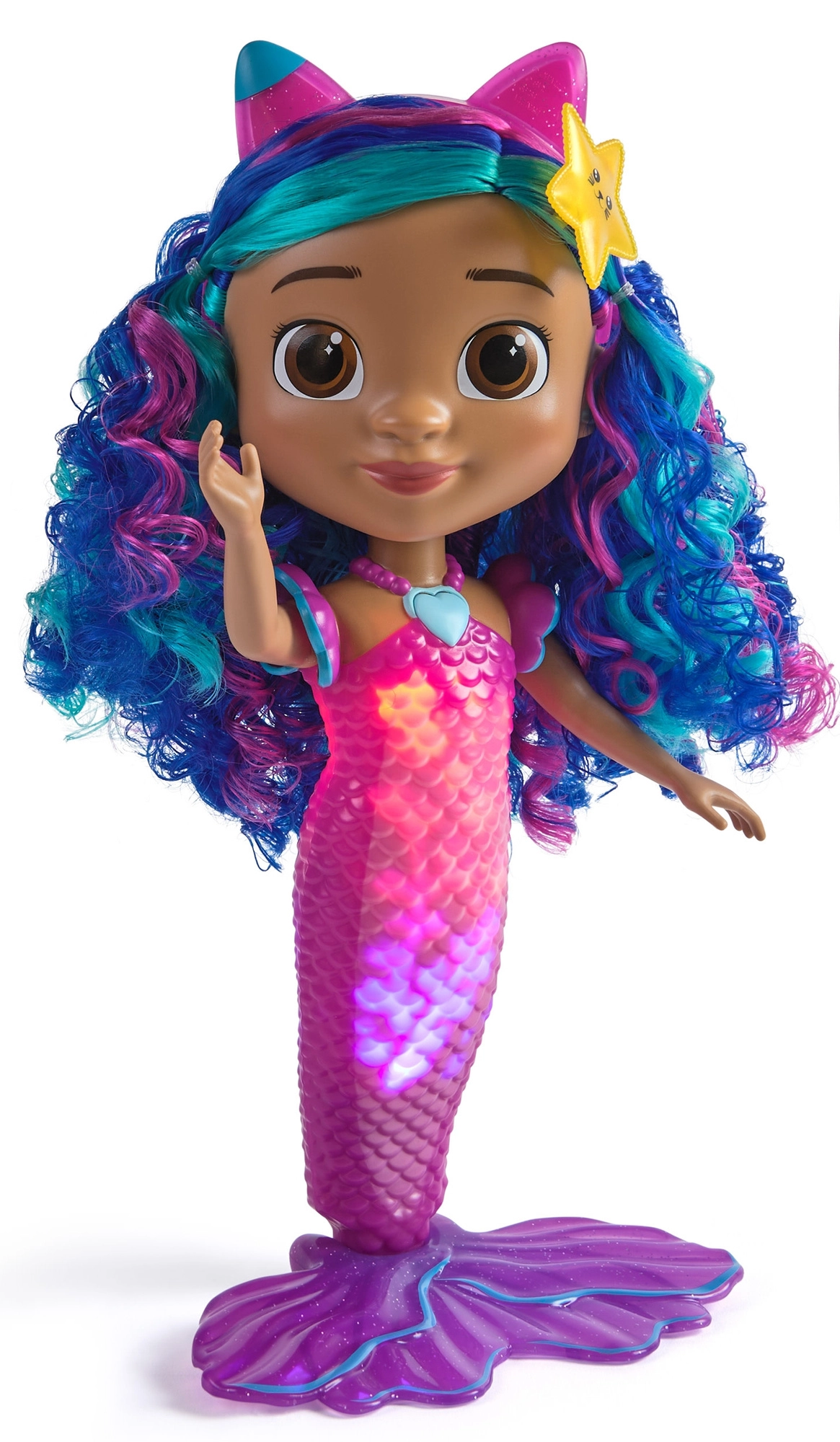 Druk op de hartvormige ketting om lichteffecten in de staart te activeren, samen met geluiden en zinnen uit Gabby’s Magisch Poppenhuis.