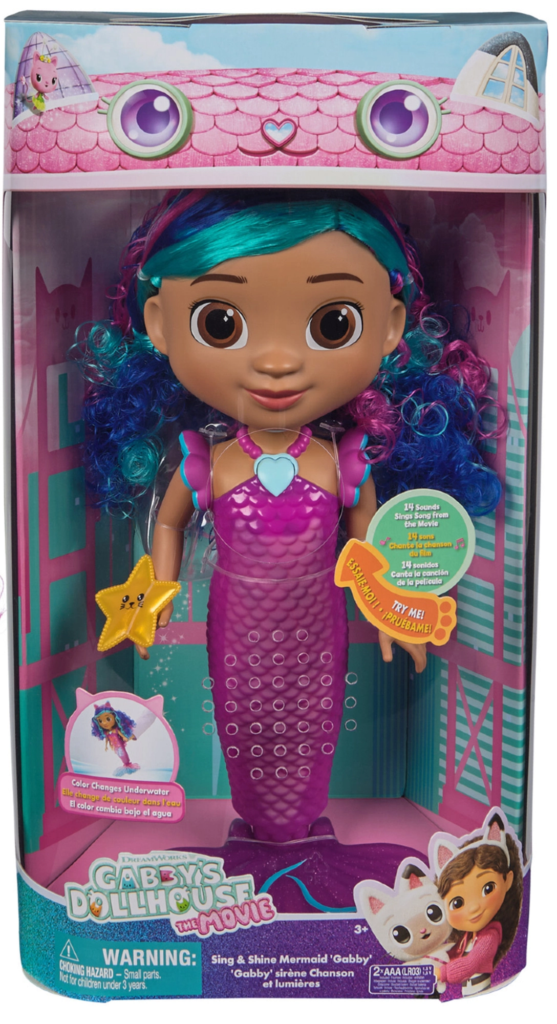 Zeemeermin Gabby betovert kinderen met opvallende kleuren, speels design en interactieve functies. Door op de hartvormige ketting te drukken, gaan de lichtjes aan en hoor je tot 14 geluidseffecten, zinnen en melodieën geïnspireerd op het geliefde verhaal. De kleurrijke staart licht op en zorgt bij elk spel voor een schitterend schouwspel.