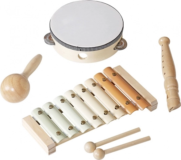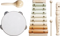 Tamboerijn, maraca, fluit en xylofoon met stokjes bieden kinderen een breed scala aan klanken en speelmogelijkheden.