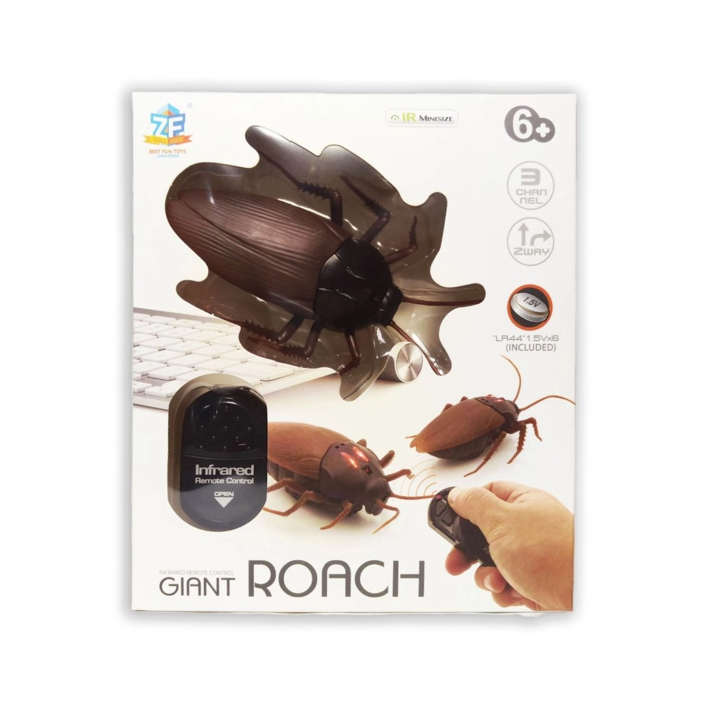 Een leuke speelgoedsensatie: een realistische RC-kakkerlak met infrarood afstandsbediening waar zowel kinderen als volwassenen van zullen genieten. Biedt besturing vooruit/achteruit en links/rechts, oplichtende ogen, demobewegingsmodus, bereik tot 8 m en speeltijd van circa 20 minuten. Batterijen 6× LR44 inbegrepen. Geschikt voor kinderen vanaf 6 jaar.