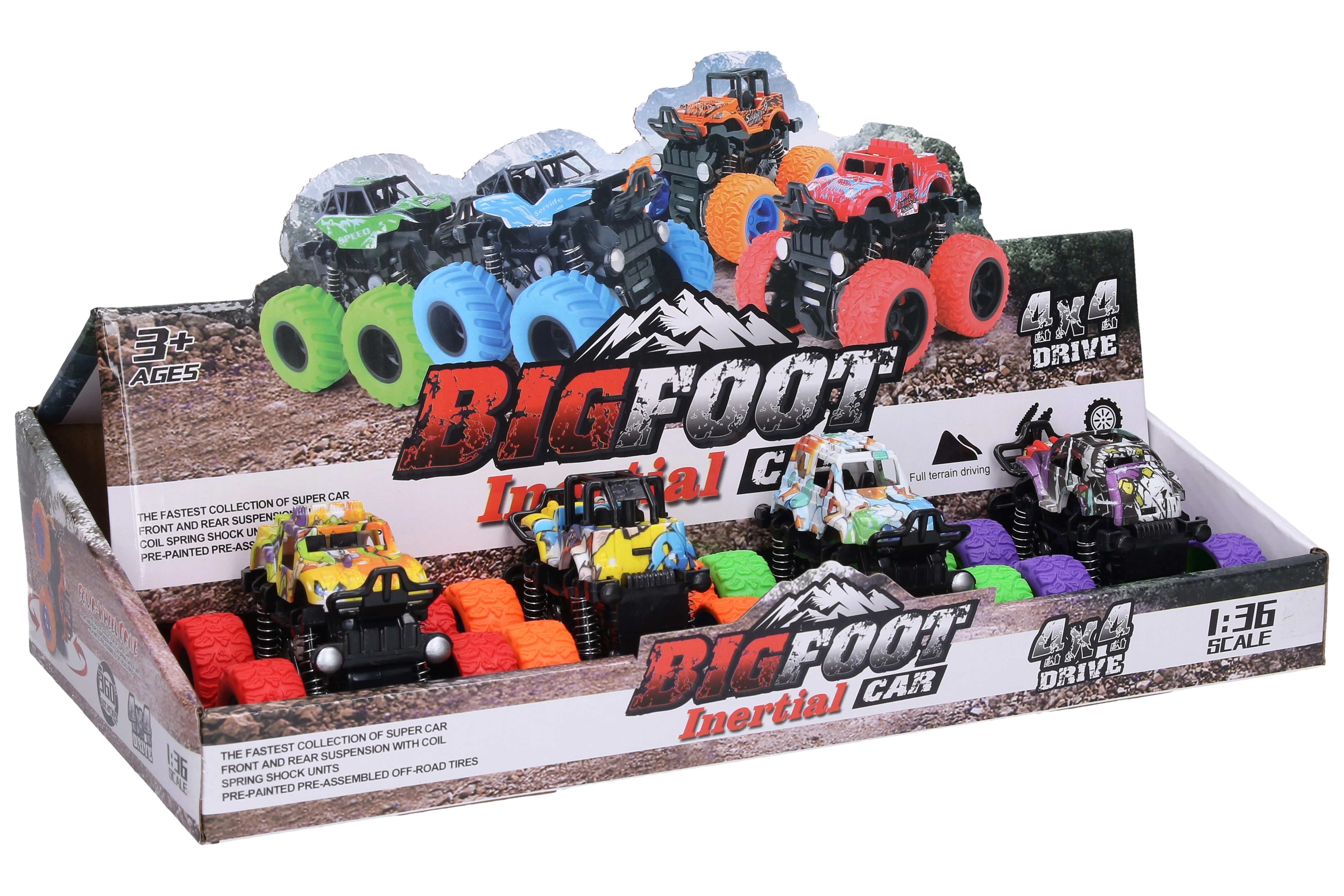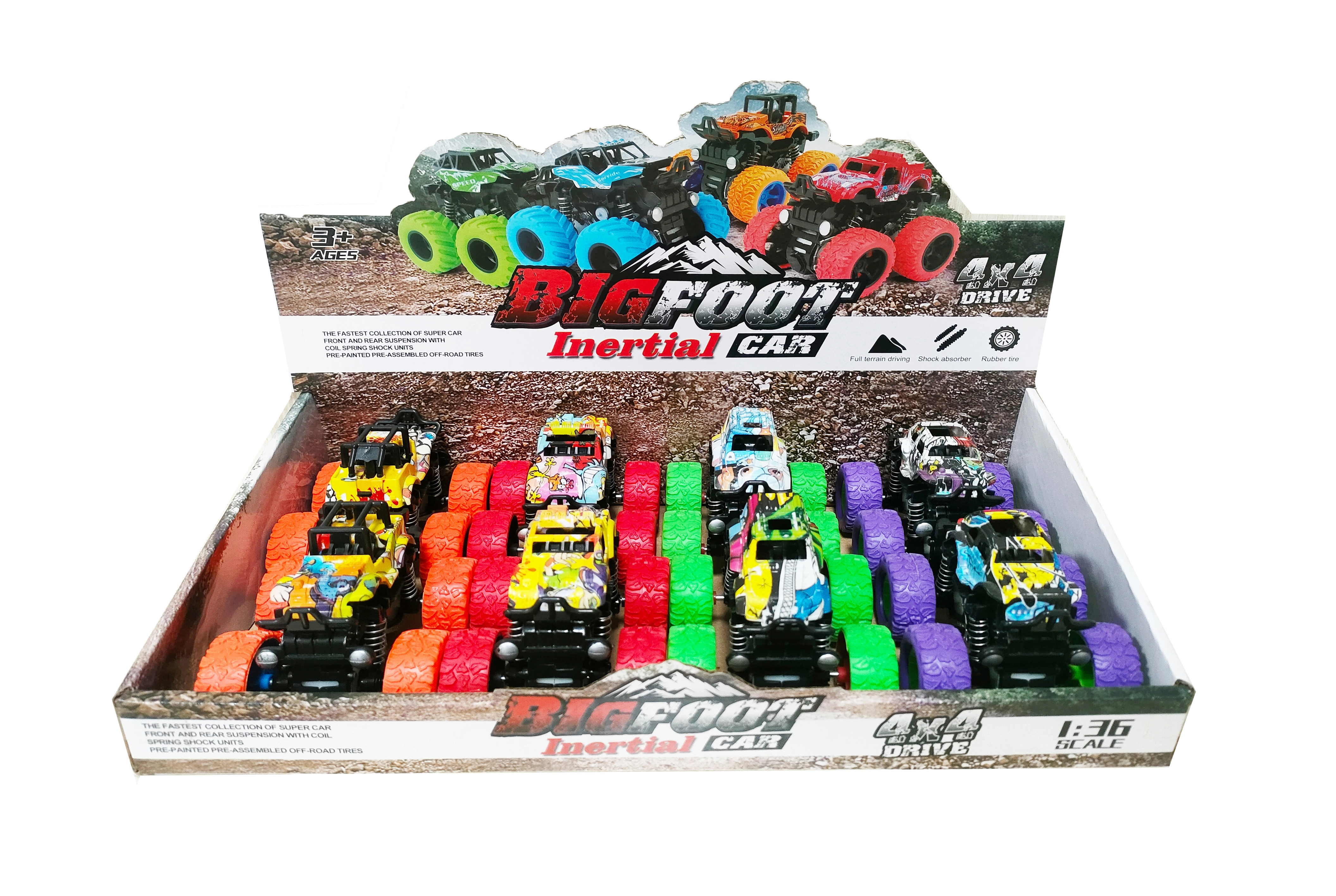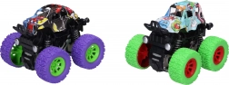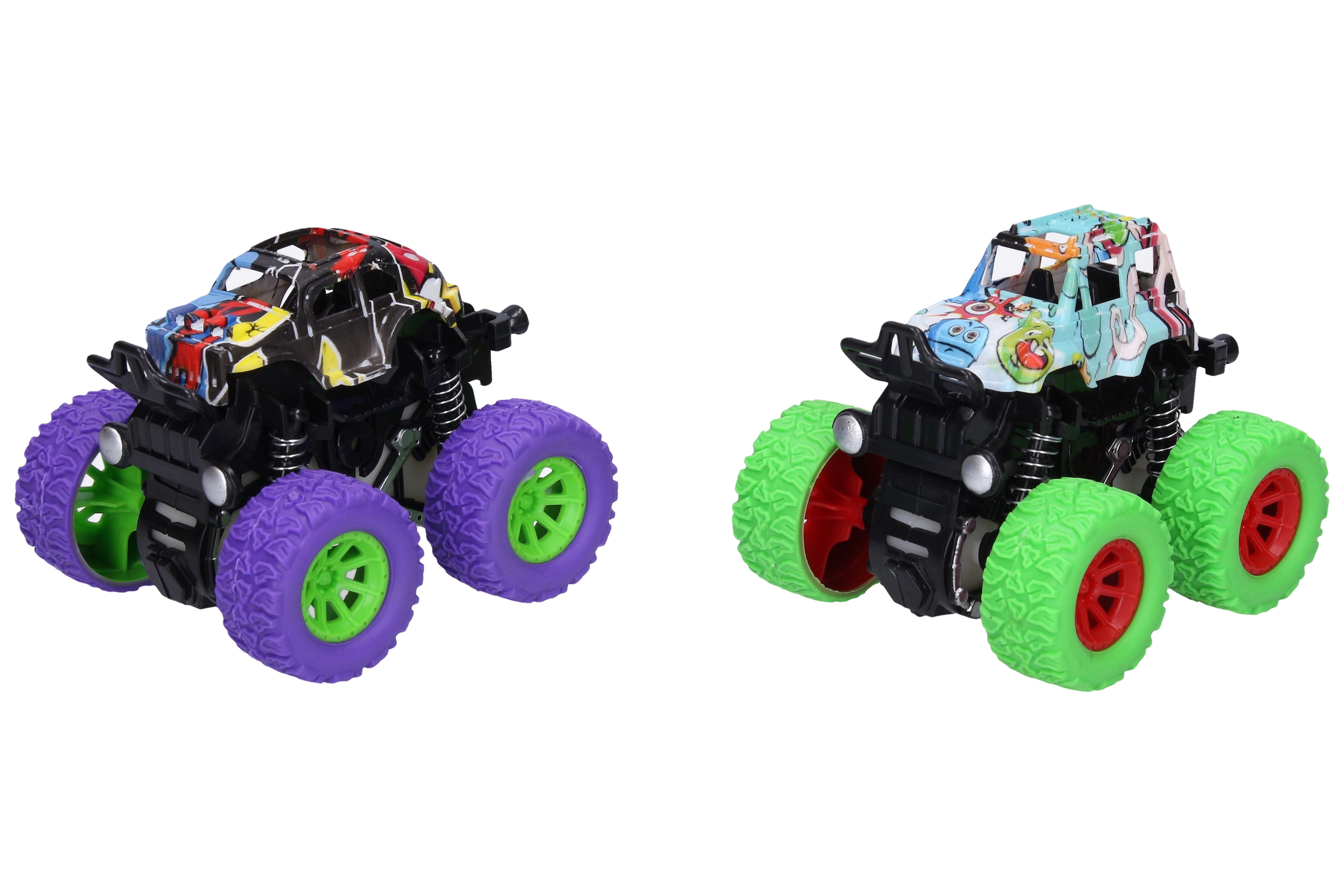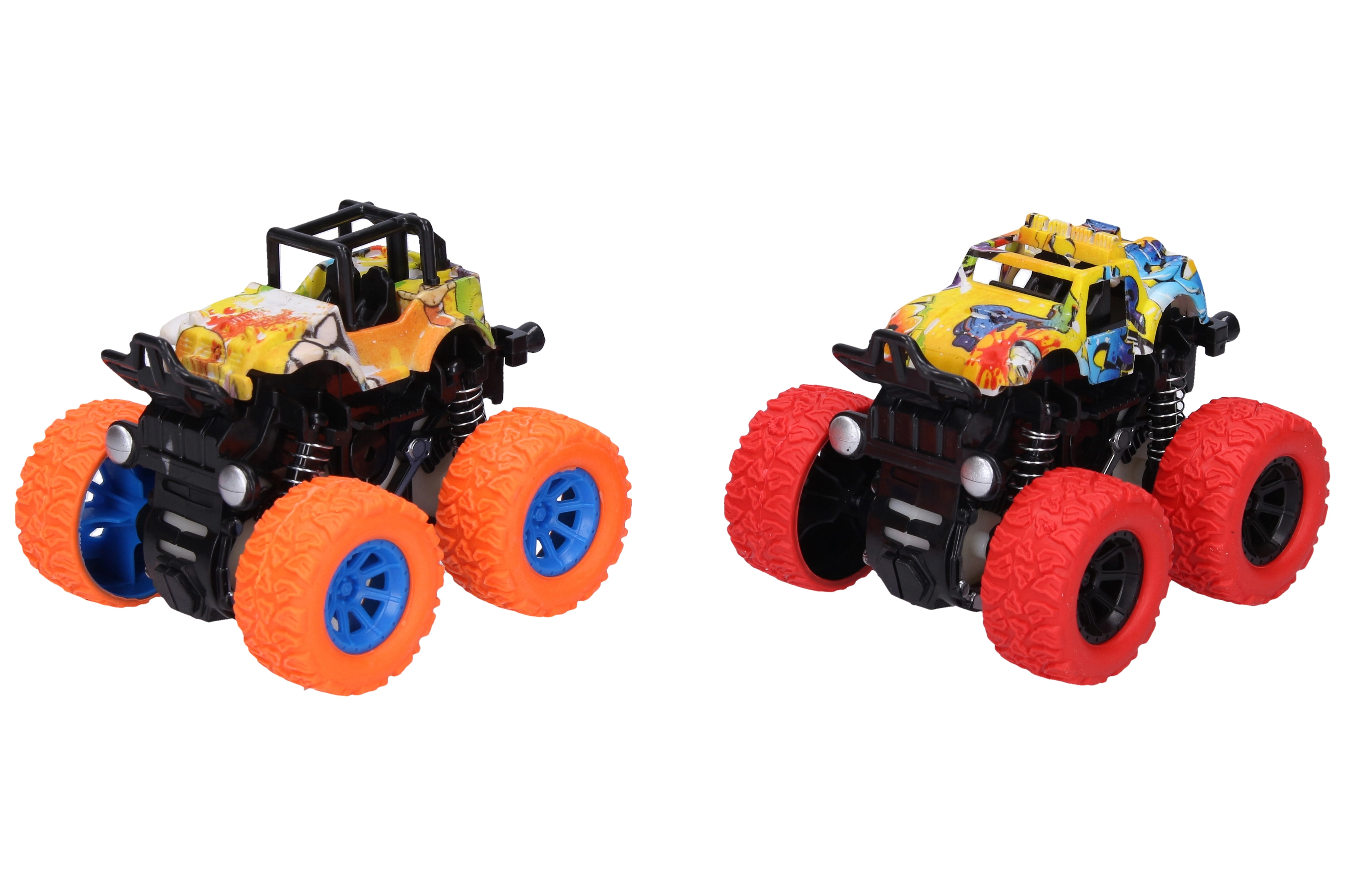 Deze terreinwagentjes van ca. 9 cm met frictie-/vliegwielaandrijving trek je naar achteren en laat je los – ze schieten met hoge snelheid vooruit. De stoere carrosserieën met graffitimotieven in diverse kleurvarianten trekken de aandacht en stimuleren creatief spel.