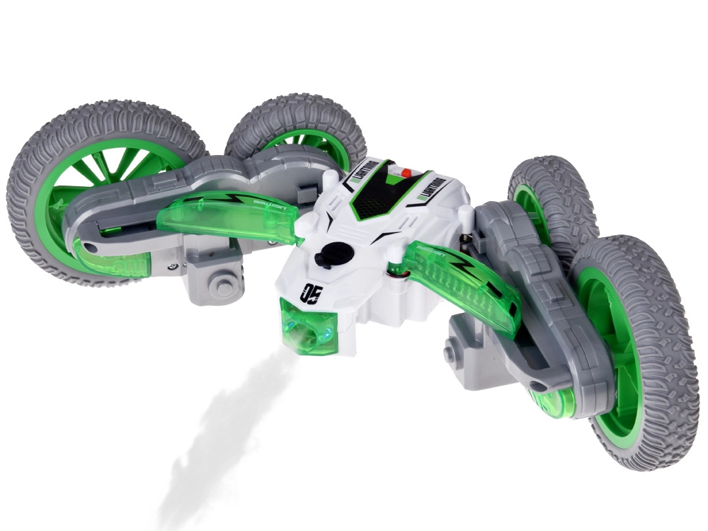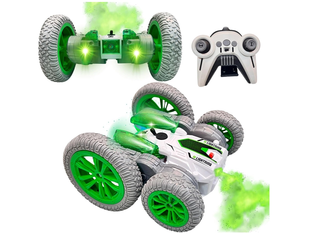 Deze supersnelle RC stuntauto tilt thuisraces naar een hoger niveau. Hij rijdt vooruit en achteruit, kan 360° draaien, omklappen en op beide zijden rijden. Voorste LED’s en realistische waterdamp creëren een “rook”-effect dat extra show toevoegt aan de rit.