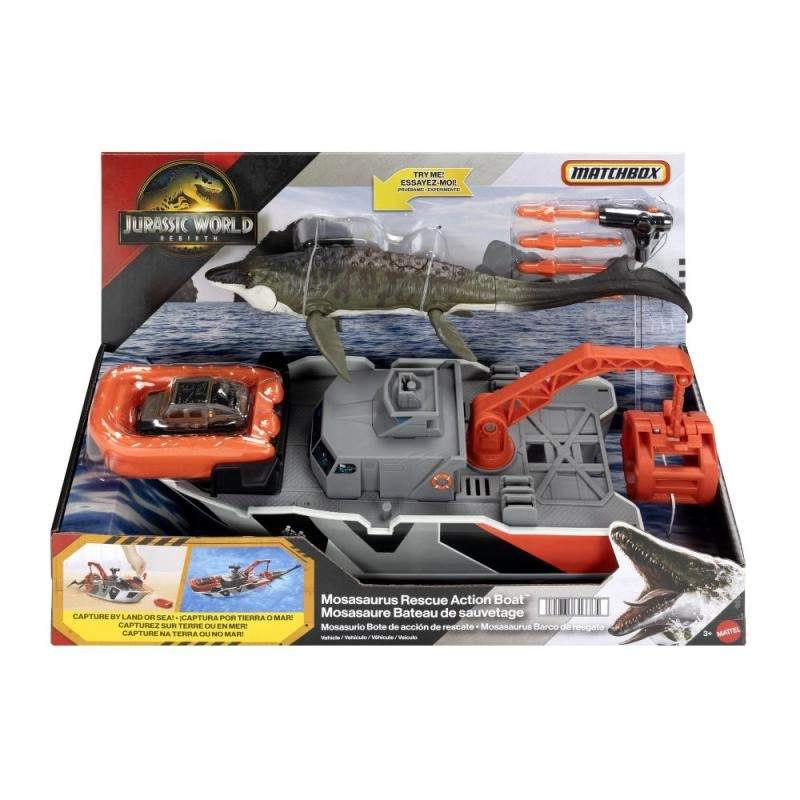 Ga op een avontuurlijke missie met deze Matchbox-reddingsboot uit de collectie Jurassic World. Het 32 cm lange schip vaart op water en rijdt op land, biedt een werkende lier voor het vervoeren van de meegeleverde mosasaurus (33 cm), afvuurbare harpoenen voor actievol DNA-jagen en een afneembare reddingsboot met een metalen Jeep 1:64. Een geweldige set voor liefhebbers van dinosaurussen en actie-missies.