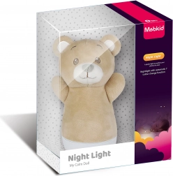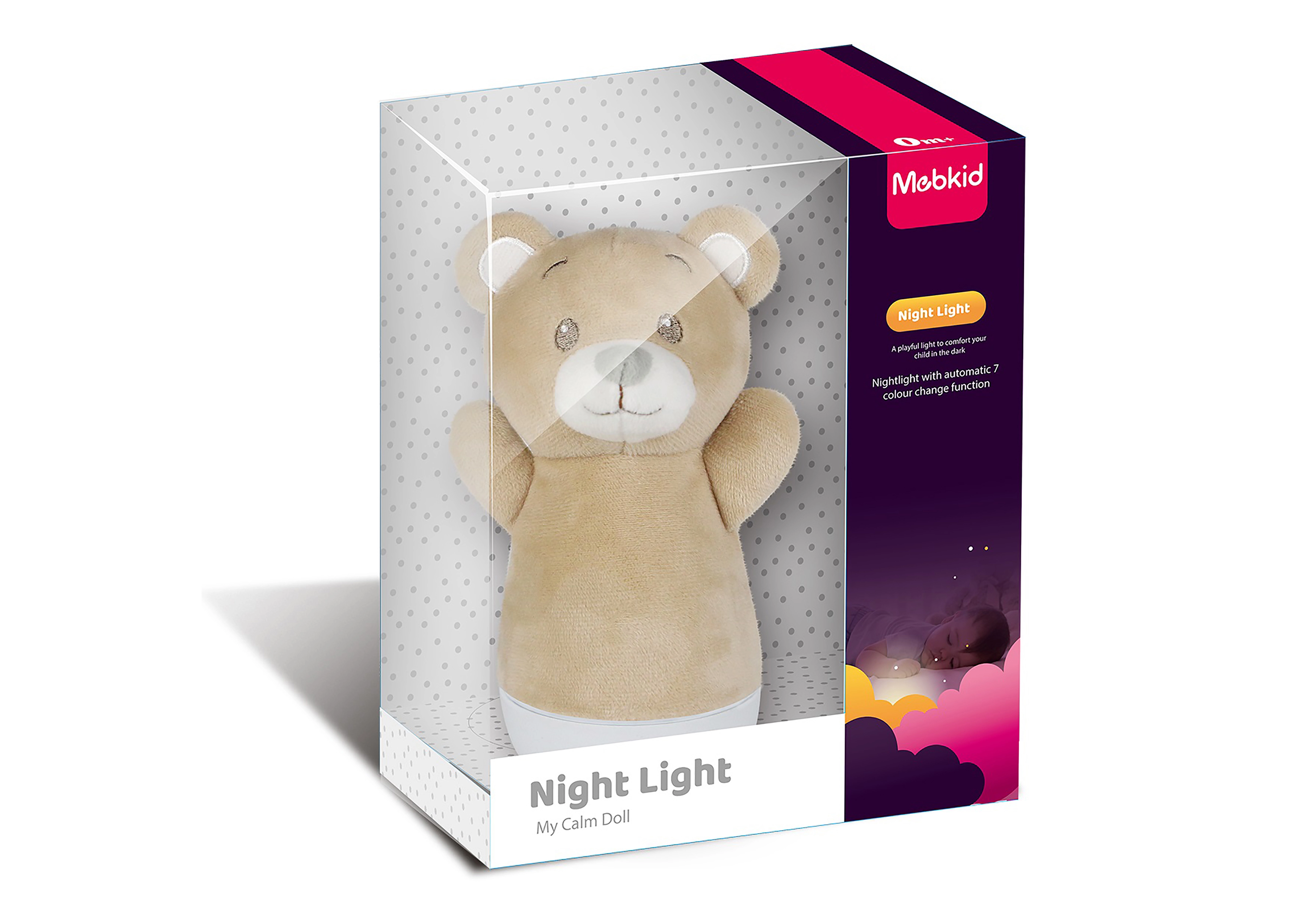 Schattig pluchen nachtlampje in de vorm van een beertje helpt kinderen rustig in slaap te vallen. Biedt automatisch wisselend gekleurd licht (7 kleuren), eenvoudige bediening met een schakelaar aan de onderzijde en compacte afmetingen ideaal voor op het nachtkastje.