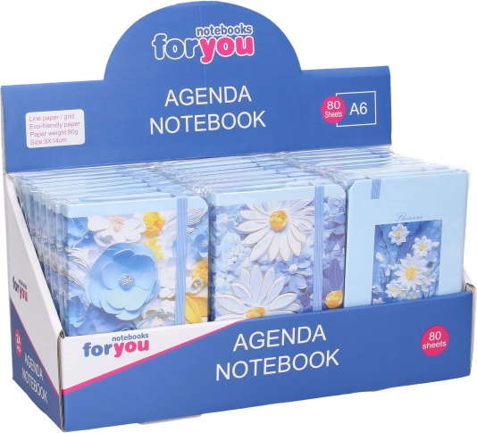 Zakformaat gelijnd notitieboek 9 × 14 cm met bloemenmotief. 80 gelijnde pagina’s, 4 ontwerpvarianten. Ideaal voor school, werk en onderweg.