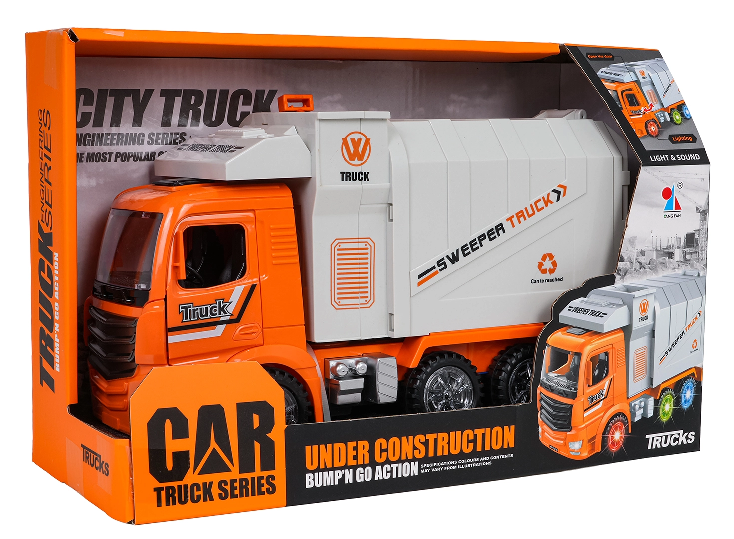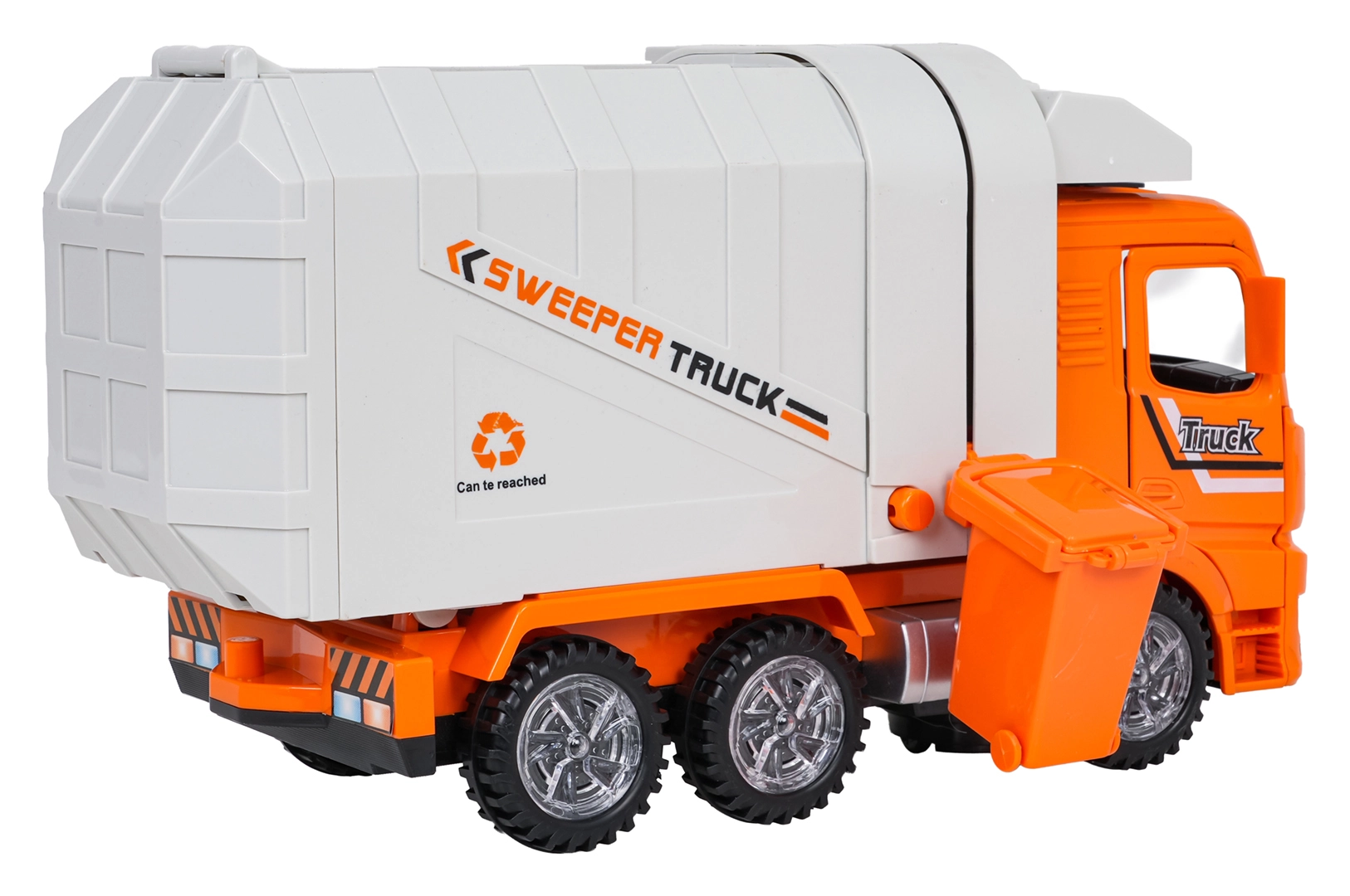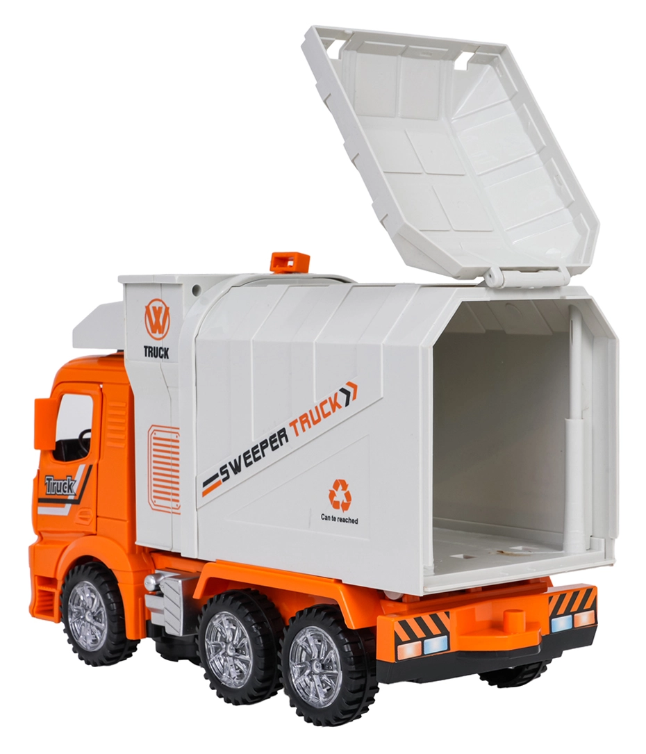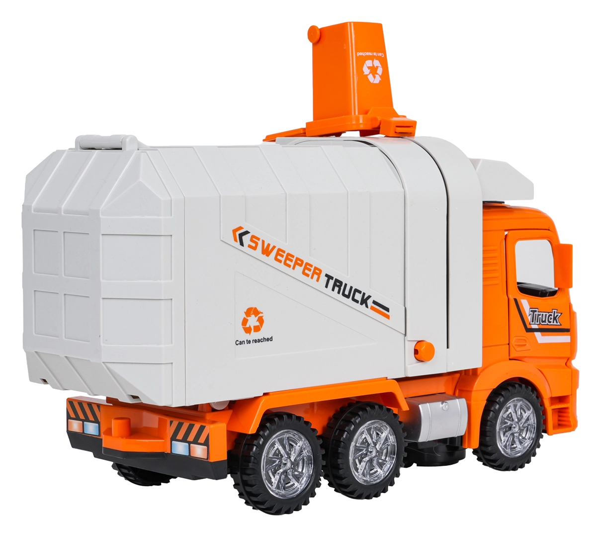 Naast de elektronische functies biedt de wagen ook handmatige mogelijkheden – je kunt de achterklep openen en de afvalbak kiepen rechtstreeks in de laadschacht. De robuuste constructie en verlichte elementen zorgen voor urenlang veilig speelplezier voor kleine chauffeurs vanaf 3 jaar.