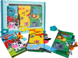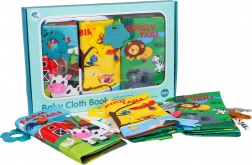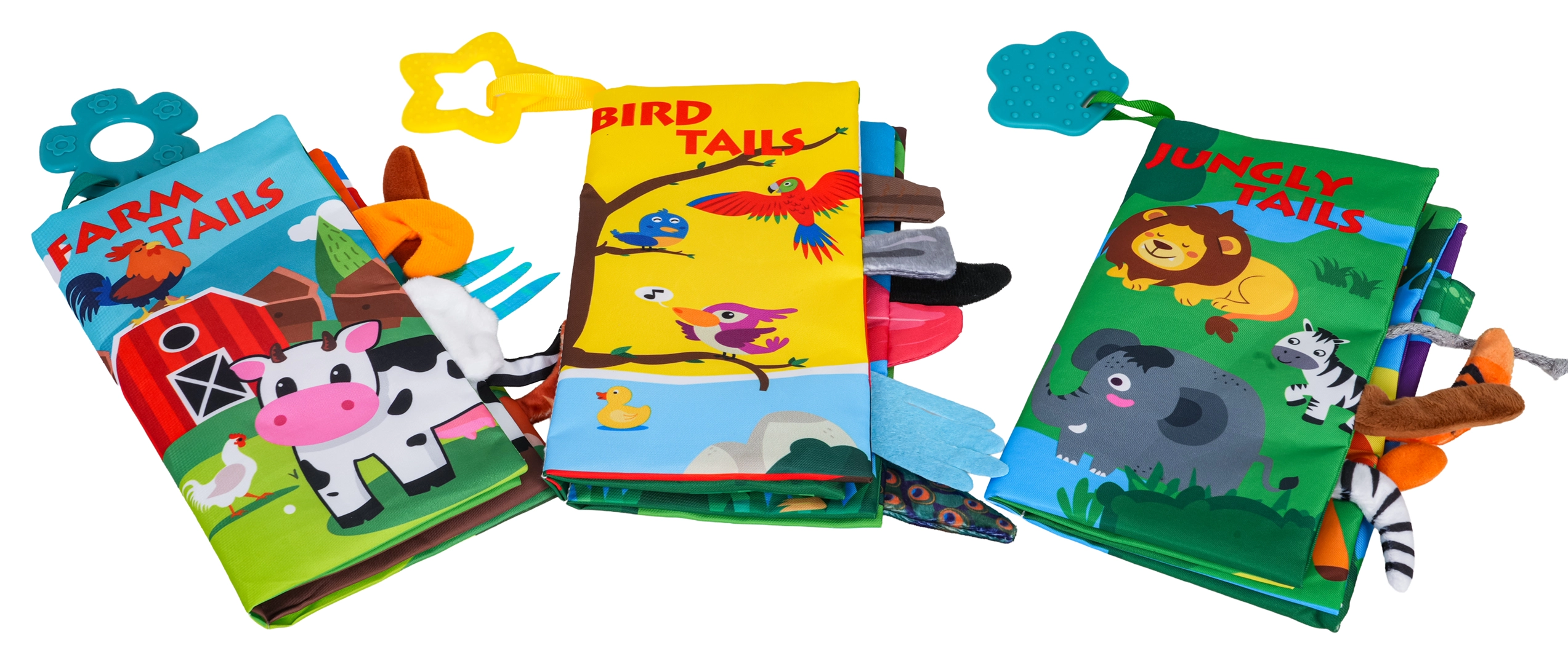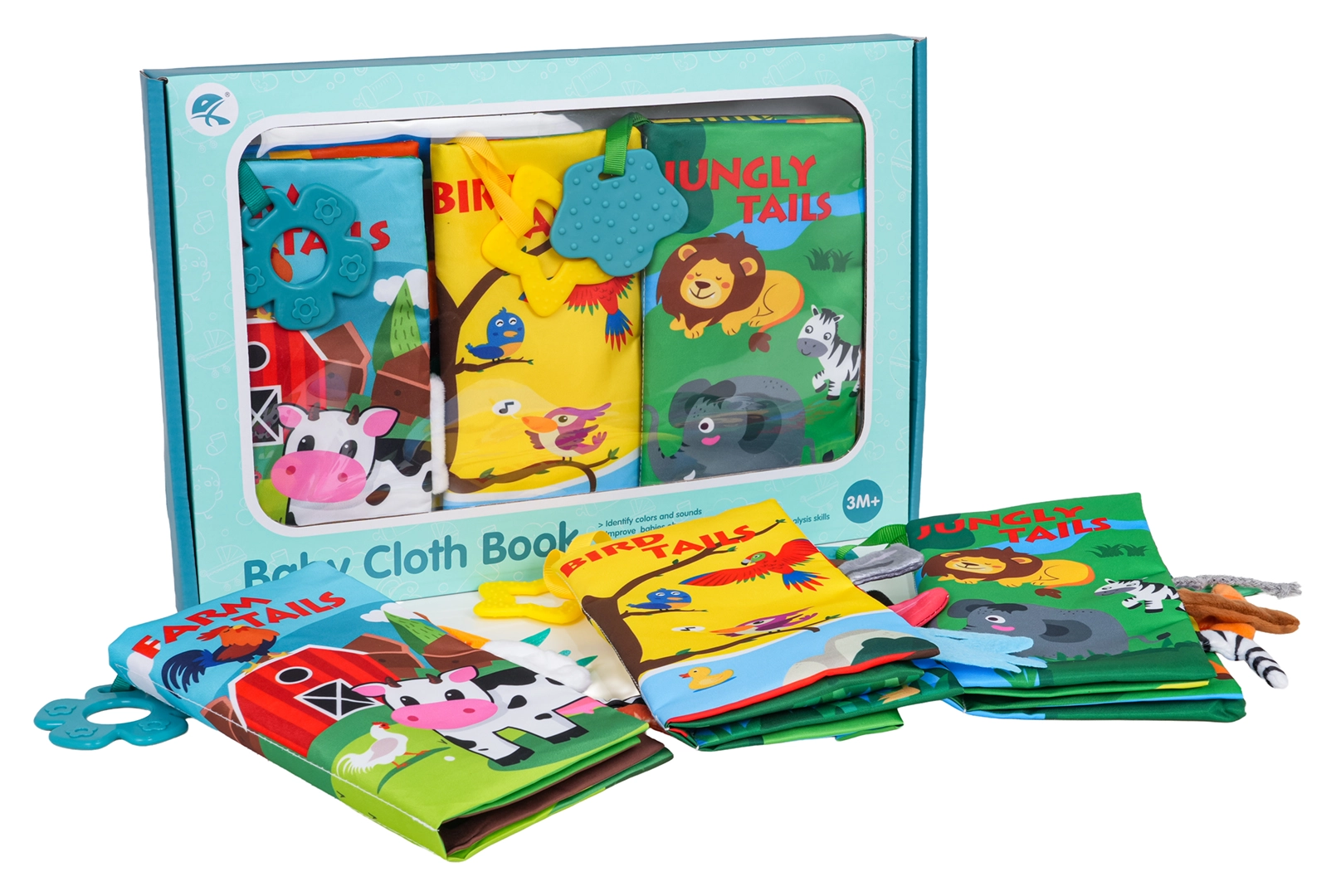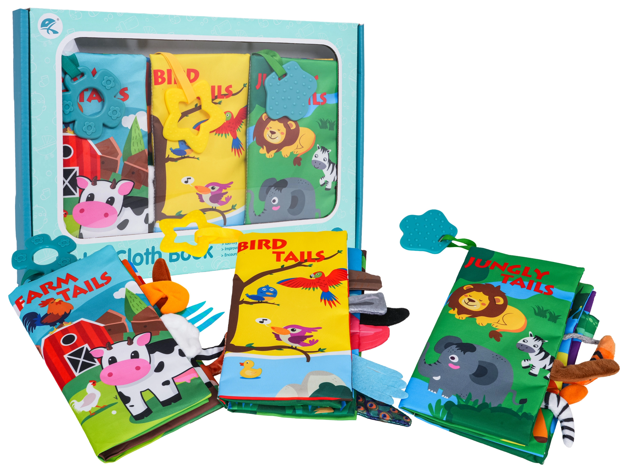 Set van zachte stoffen babyboekjes met staartjes en bijtringen
