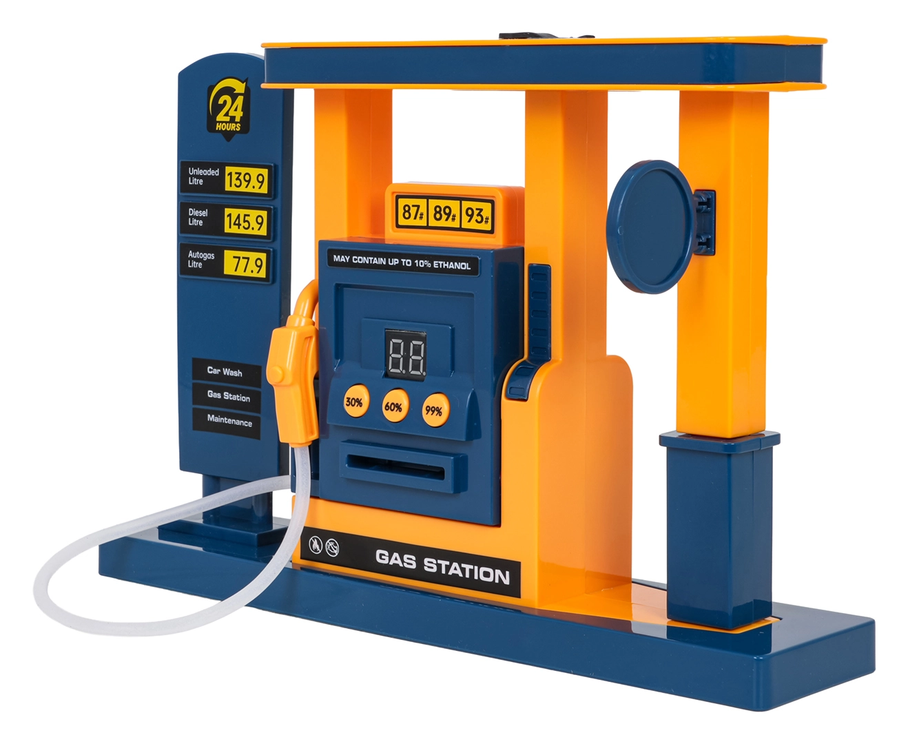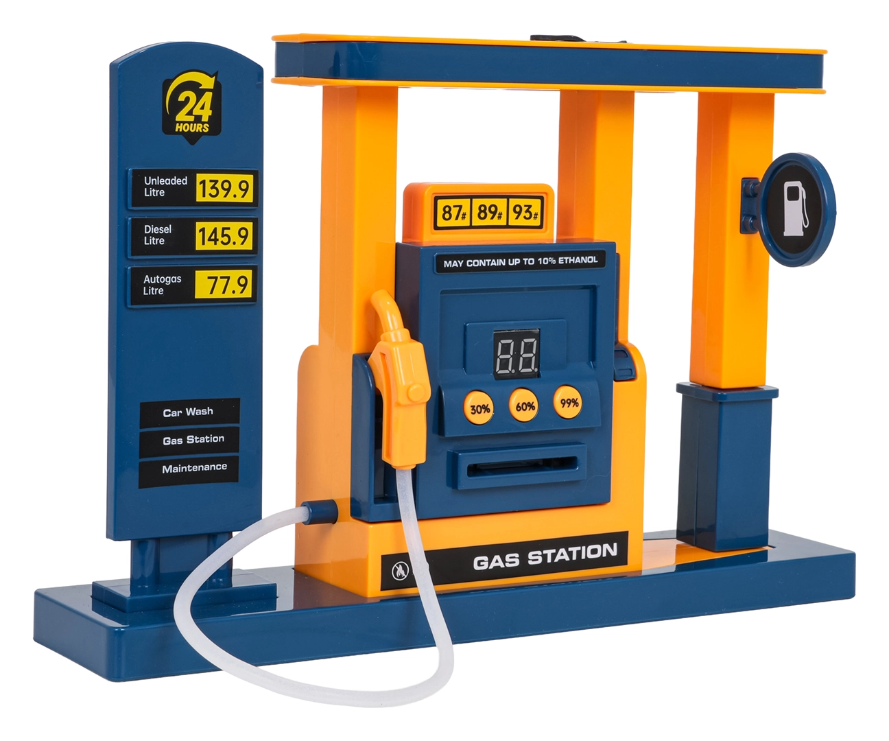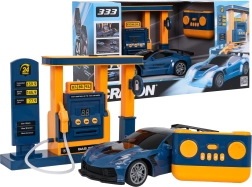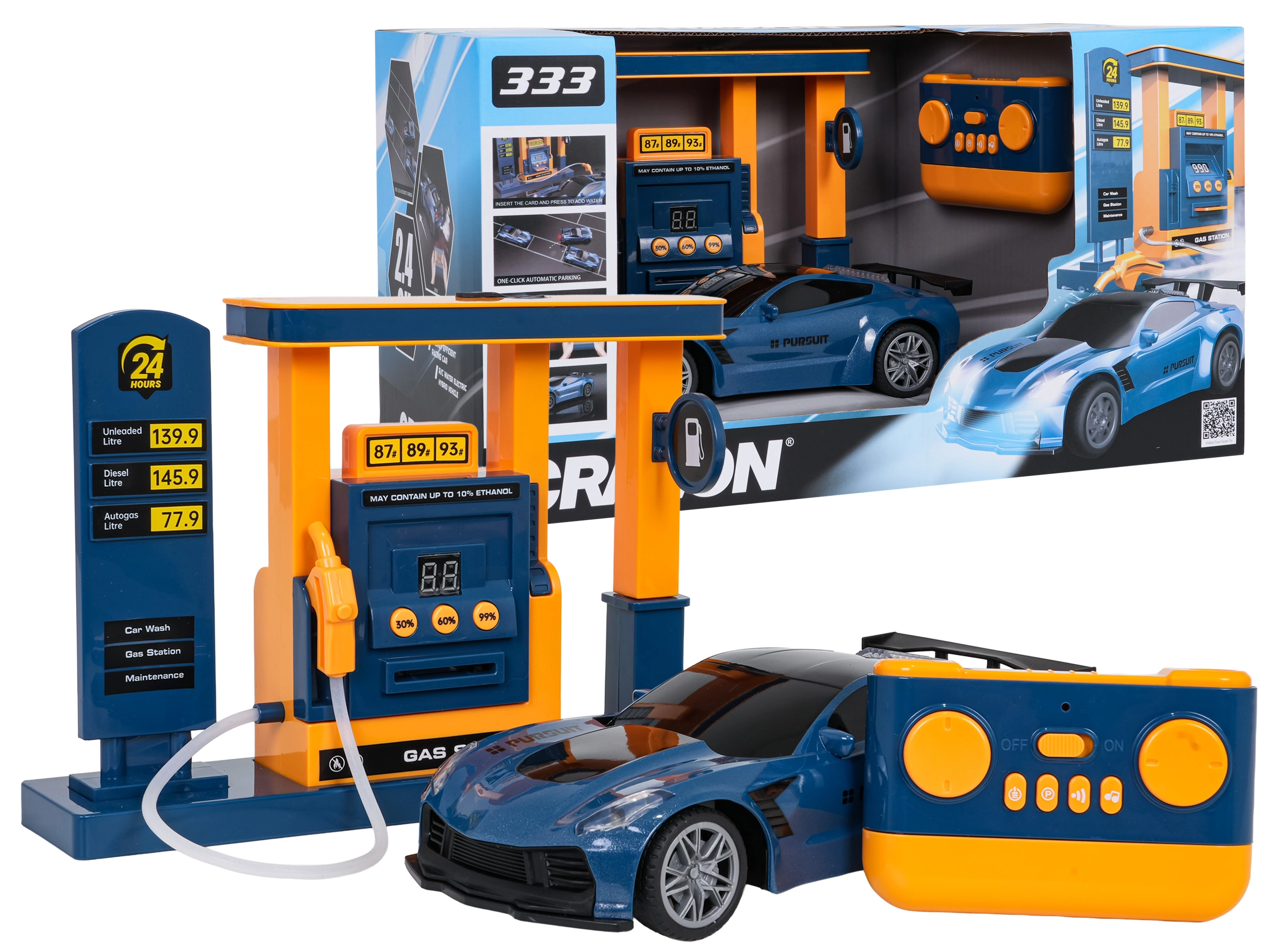 Ontdek een interactieve set die racen met afstandsbediening combineert met realistisch tanken. Vul het station met water, houd de kaart erbij, kies het niveau 30/60/99% en tank – de auto rijdt pas na het “vullen”. Tijdens het rijden komt er uit de uitlaat een rookeffect dat de racesfeer versterkt.