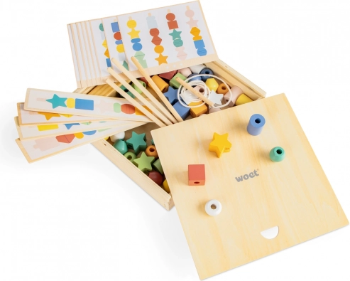 Ontdek een creatieve houten set om te sorteren en te rijgen die zowel de motoriek als de verbeeldingskracht van kinderen ontwikkelt. Spelenderwijs oefenen kinderen hun fijne motoriek, logisch denken en herkennen van kleuren en vormen dankzij 56 kralen, voorbeeldkaartjes en praktische sorteerstatieven – allemaal opgeborgen in een stevige houten doos met deksel.