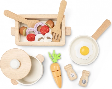 Stijlvolle houten servies-set voor kleine koks vanaf 3 jaar, goed voor uren creatieve pret. Bevat een koekenpan, een pan met deksel, twee spatels, een zoutvaatje en een pepervaatje, een wortel met klittenband en andere ingrediënten. Stimuleert rollenspel, fantasie en fijne motoriek. Gemaakt van duurzaam hout – de ideale aanvulling voor iedere kinderkeuken.