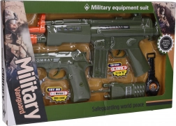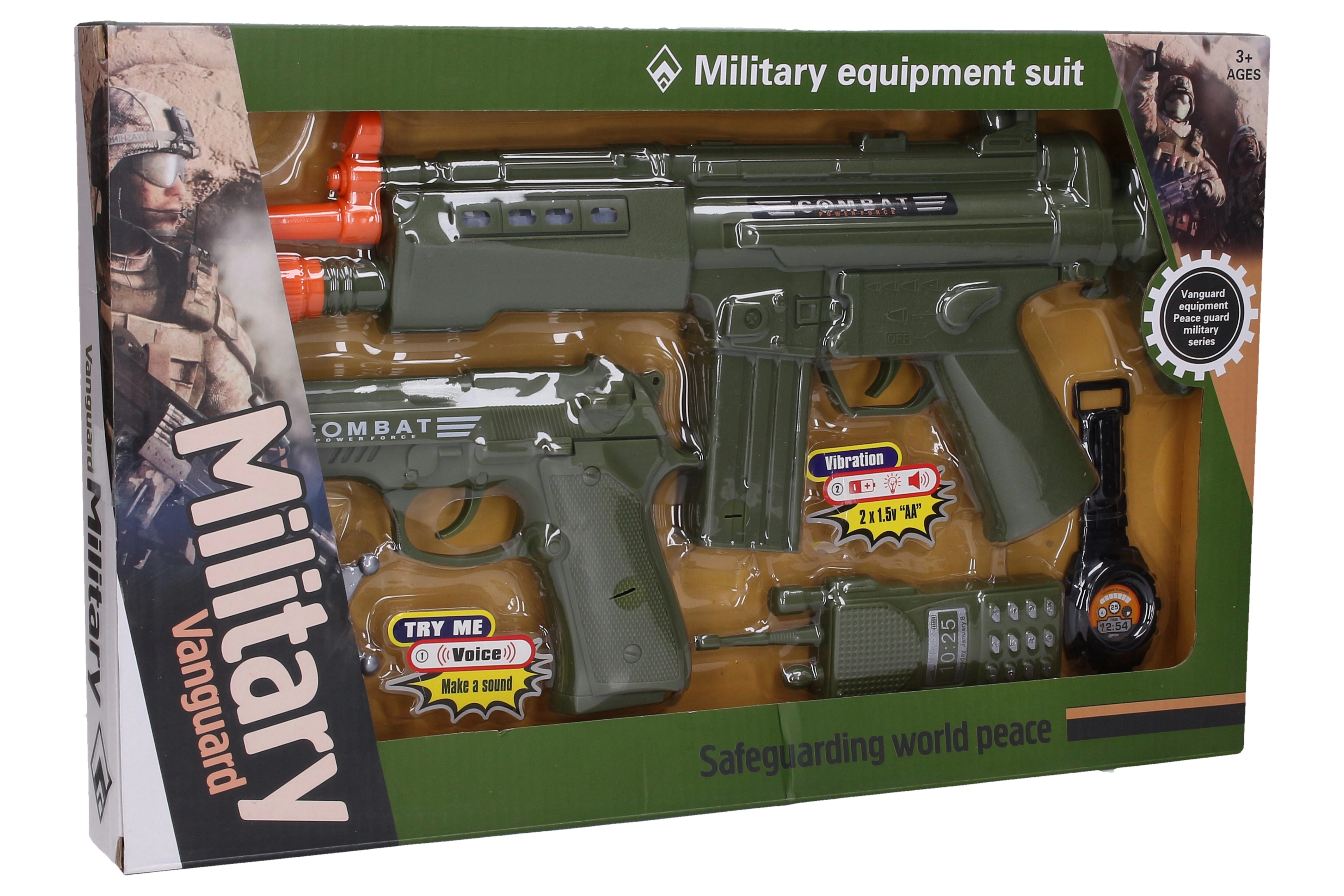 Compleet militair set voor kleine avonturiers bevat een machinegeweer, pistool, badge, walkietalkie en horloge. Het speelgoed geeft licht- en geluidseffecten die de spelervaring versterken. Het machinegeweer wordt gevoed door 2× AA-batterijen (meegeleverd), zodat kinderen meteen kunnen spelen.