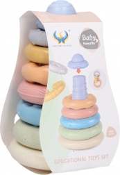 Kleurrijke bouwset voor de allerkleinsten: toren van ringen op een staaf met een hoogte van 20 cm ontwikkelt de fijne motoriek, logica en coördinatie. De ringen kunnen op de staaf worden geregen of aan elkaar worden gekoppeld tot een ketting voor extra speelplezier.
