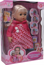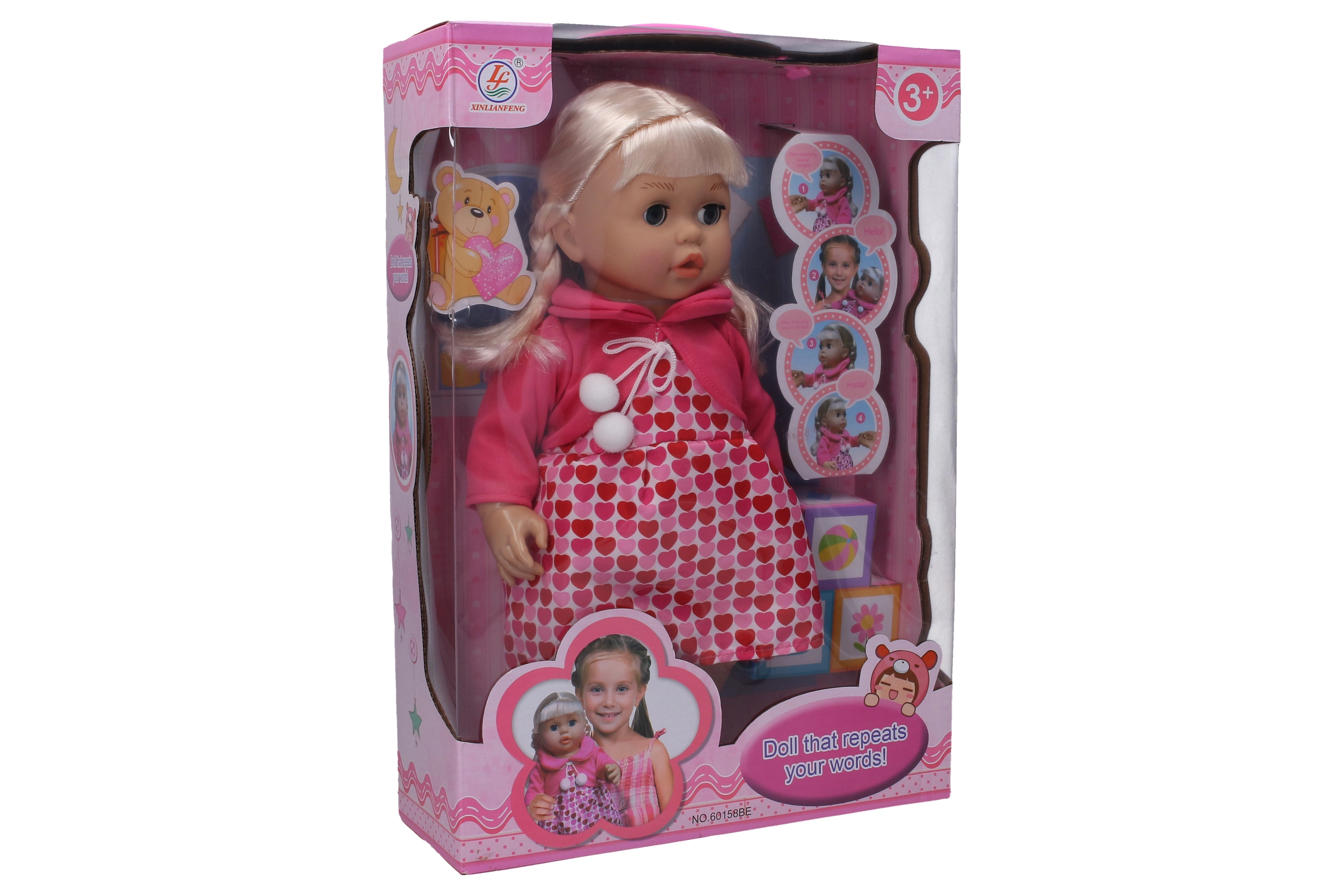 Deze interactieve pop brengt kinderen veel plezier én leert momenten. Door de rechterhand in te drukken klinkt een geluid en start de pop met opnemen – spreek eenvoudig richting haar mond. Door de rechterhand opnieuw in te drukken beëindig je de opname. Met de linkerhand speelt de pop de opname af. De eenvoudige bediening is ook voor kleinere kinderen geschikt.