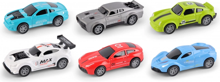Ontdek deze set compacte metalen raceautootjes, ideaal voor kinderhanden en races thuis. Dankzij de robuuste metalen carrosserie en de vrije wielen rijden ze soepel en leuk op verschillende ondergronden. De diverse kleurvarianten en prints brengen afwisseling in het spel en stimuleren de fantasie.