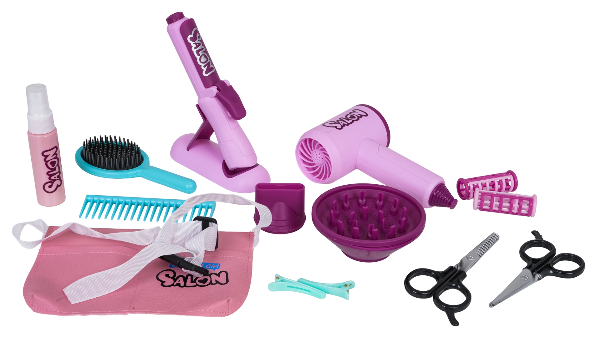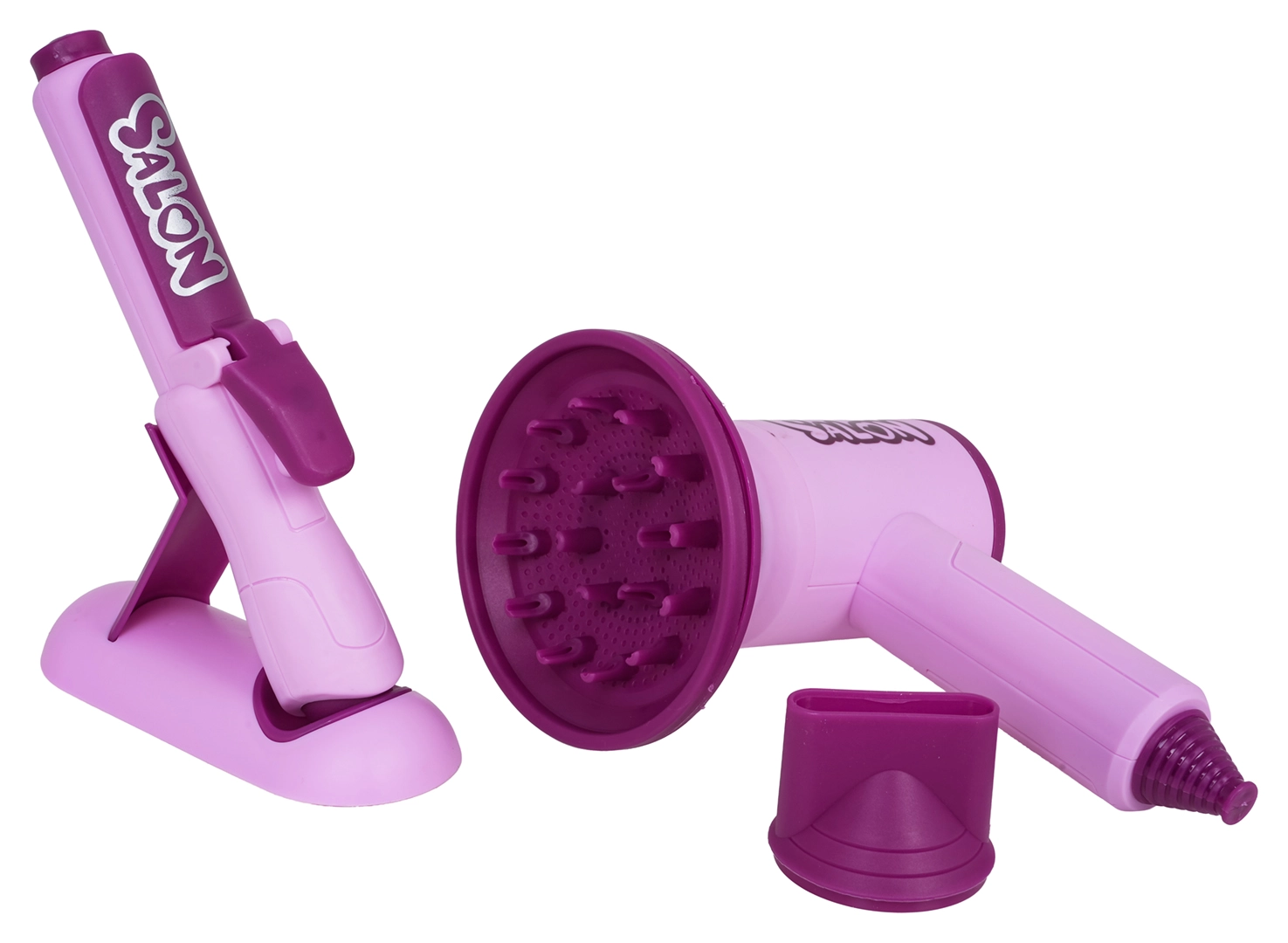 Onderdeel is een kinderlijke föhn met twee opzetstukken (diffuser en concentrator), die het geluid van föhnen produceert en een zachte luchtstroom geeft voor een authentieke ervaring. De kinderstijltang werkt op knoopcelbatterijen en heeft een lichteffect. De set wordt aangevuld met een kam, borstel, schaar, effileerschaar, speldjes, krulspelden en een flesje voor “cosmetica” – perfect voor creatief spel en de ontwikkeling van de fijne motoriek.