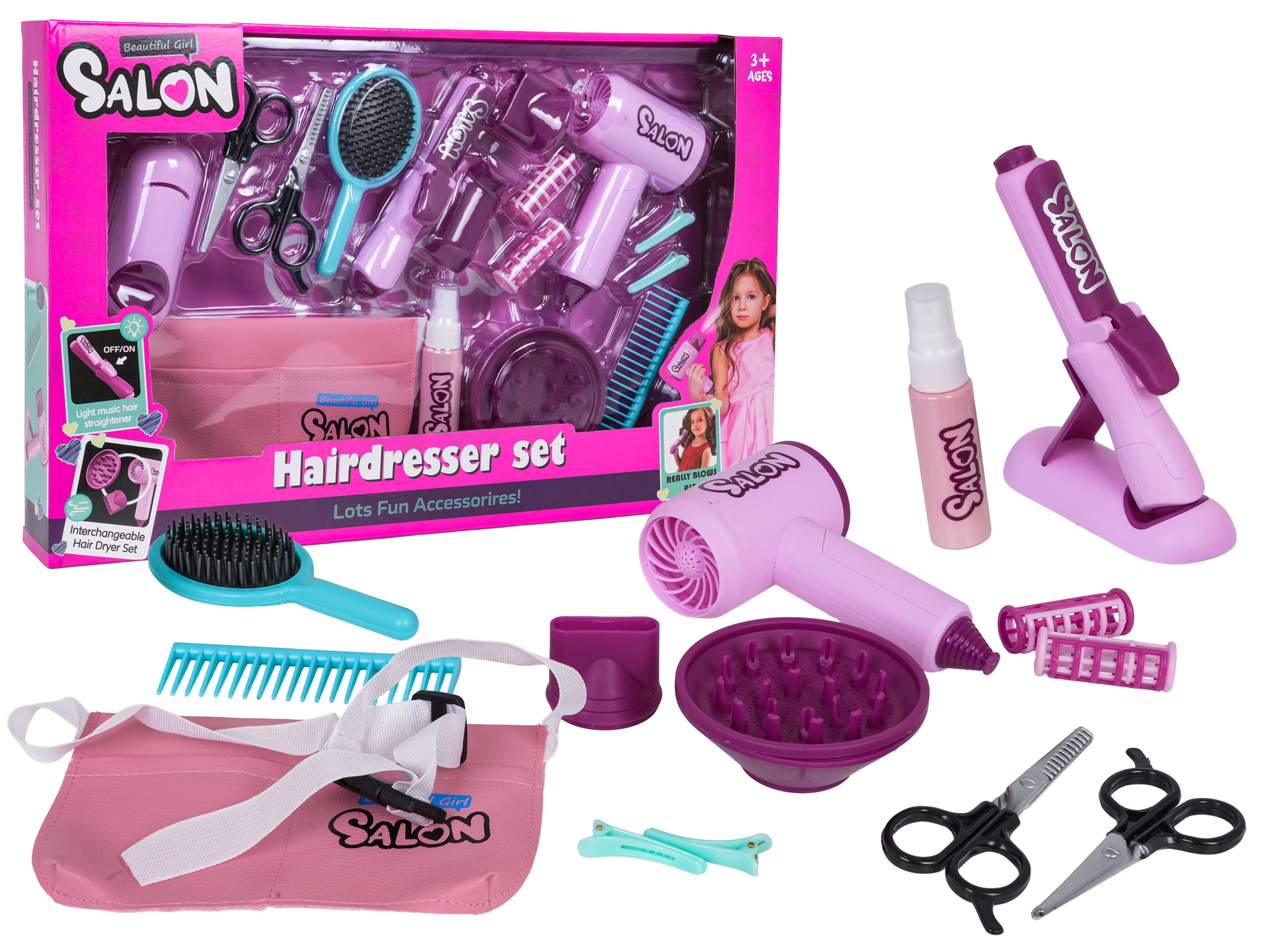Ontdek de magie van je eigen salon met deze rijk uitgeruste set voor kleine kapsters vanaf 3 jaar. De set bevat een functionele kinderlijke föhn met verwisselbare opzetstukken, een verlichte stijltang, een krultang, kam, borstel, speldjes, krulspelden, schaar en een praktische roze heuptas. De föhn maakt geluid en geeft een lichte “luchtstroom”, de stijltang licht op – ideaal voor realistisch kappersspel.