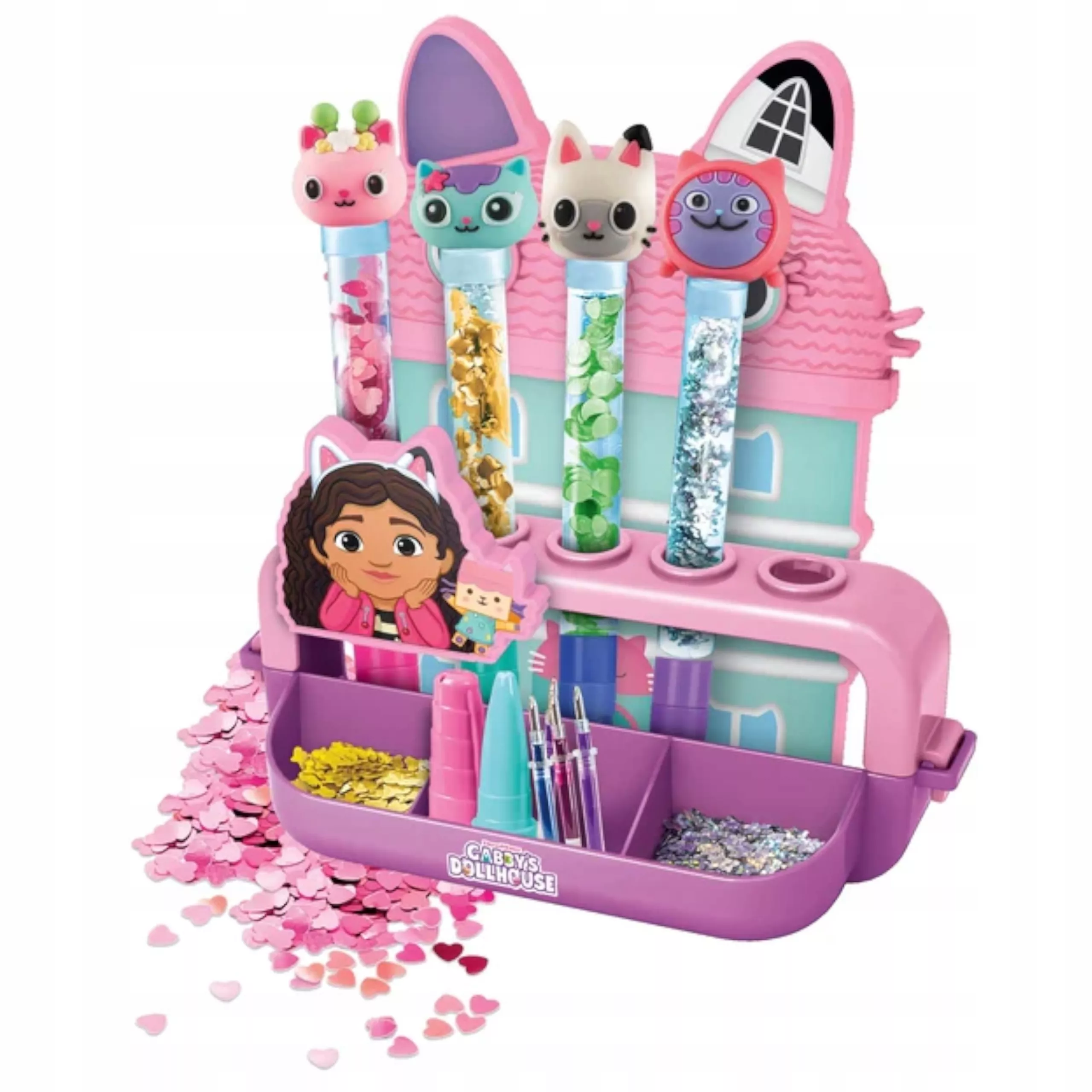 Met deze leuke “pennenfabriek” ontwerpen en versieren kinderen hun schrijfwaren helemaal zoals zij willen. Het werkstation is eenvoudig te gebruiken, maakt het doseren van versieringen mogelijk en laat pennen afwerken met glitters, confetti of stickers uit de geliefde wereld van GABBY’S DOLLHOUSE.