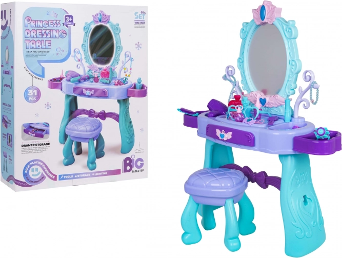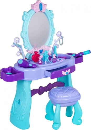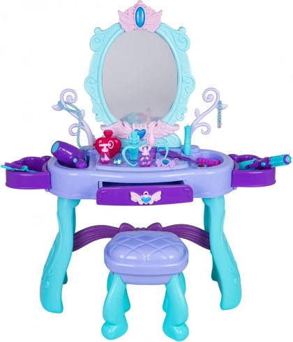 Geef kinderen hun eigen magische beautyhoek. Deze kaptafel in turquoise en paars biedt een grote ovale spiegel met verlichting, een praktische lade en zij-aflegvlakken voor alle accessoires. Het stabiele krukje zorgt voor comfortabel zitten en veilig spel.