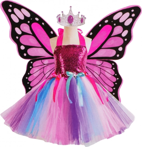 Dit kleurrijke kostuum verandert ieder kind in een echte vlinderfee. Het valt op door rijke kleuren, het regenboogeffect van de rok en indrukwekkende vleugels met LED-lichtjes en geluidseffecten. Een uitstekende keuze voor carnaval, schooloptredens, fotosessies en een speelse middag.