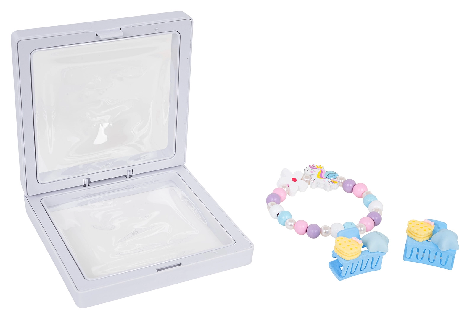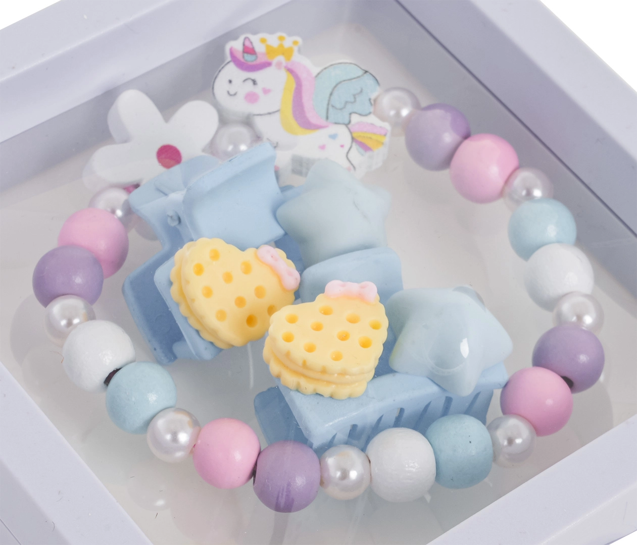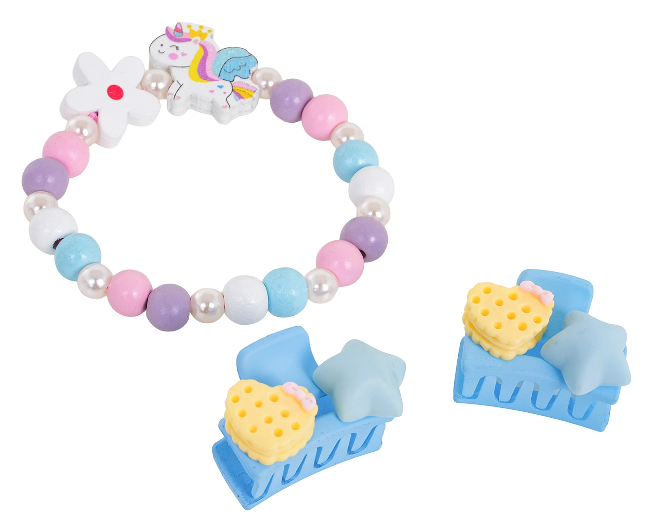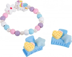 Deze charmante set voor kinderen combineert een speels eenhoornmotief met zachte kleuren en prettige materialen. De armband is gemaakt van veelkleurige houten kralen en pareltjes, aangevuld met een schattige eenhoorn-hanger. Twee praktische speldjes maken elk kapsel af en stimuleren de fantasie tijdens het spelen.