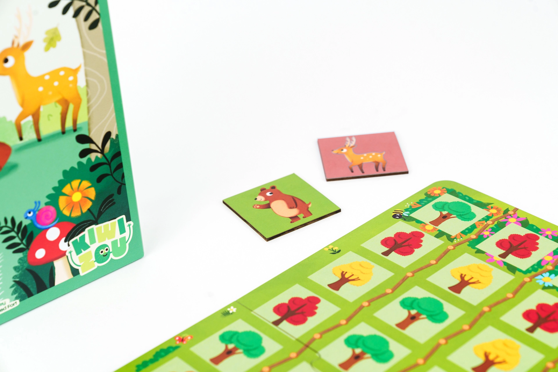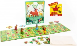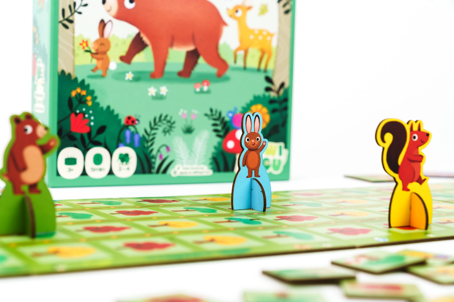 Inhoud van de doos: groot bos-speelbord (4 delen), 4 kartonnen totemfiguren van dieren, 4 karakterkaarten, 30 fiches, 12 voedselfiches, katoenen zak om te trekken.