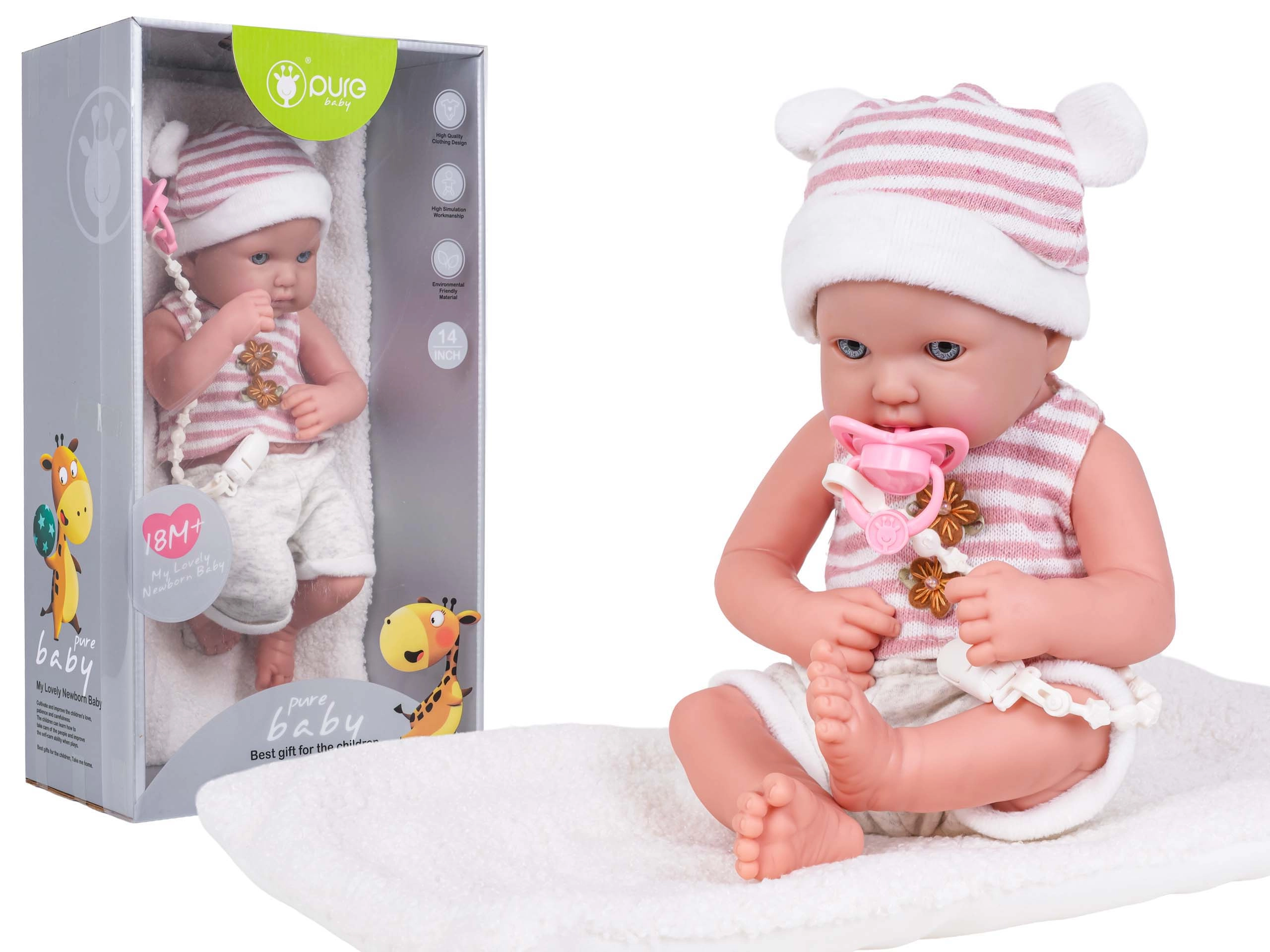 In de verpakking zit alles wat kinderen nodig hebben om te spelen: een fopspeen aan een koord om de baby te kalmeren en een zachte deken om te verschonen of in slaap te sussen. De pop is geschikt vanaf 3 jaar, heeft gemakkelijk uit te trekken kleding (muts, top en korte broek) en is eenvoudig te onderhouden.