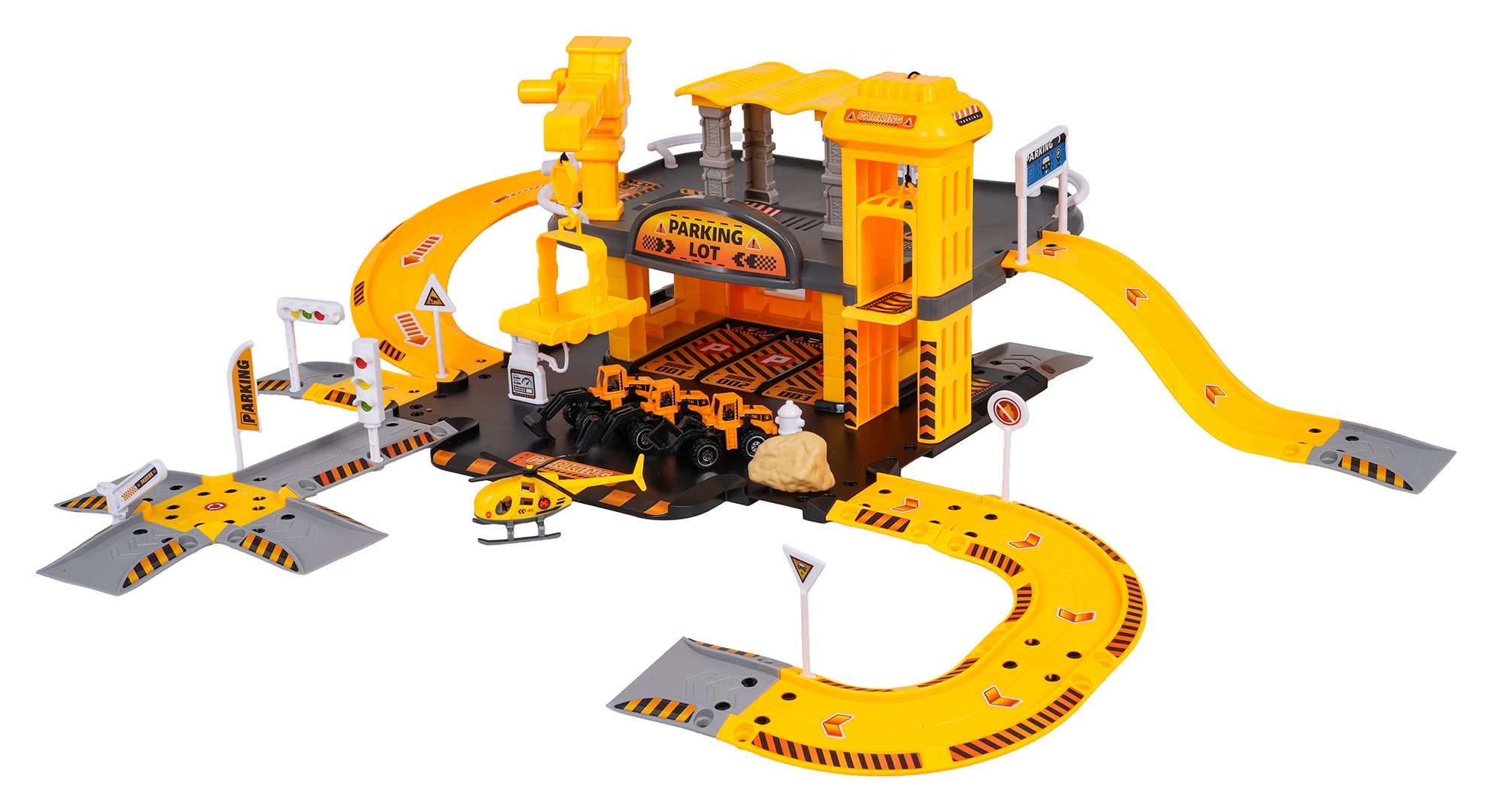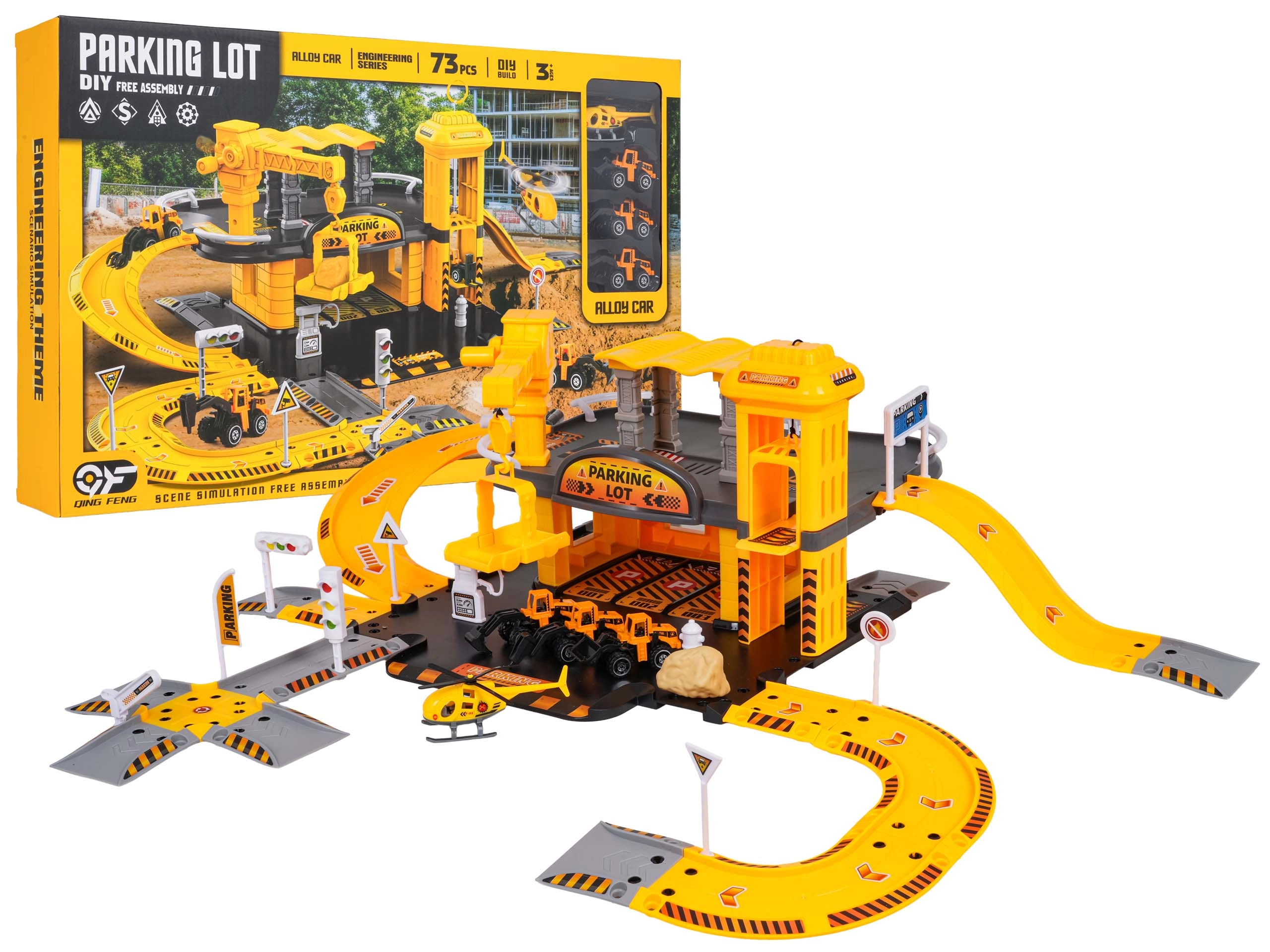 Deze gedetailleerde bouwparkeerplaats zal alle jonge fans van bouwmachines verrassen. Beneden vind je een tankstation en wegen; met de handlift breng je voertuigen naar de eerste verdieping, waar een bouwzone met werkende kraan is. De set is compact maar biedt veel speelmogelijkheden en soepele ritten over de spiraalhellingen.