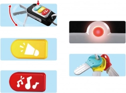 De set bevat drie bevestigde sleutels die qua kleur passen bij de knoppen op de afstandsbediening en één uitschuifbare sleutel die aan een echte autosleutel doet denken. De verschillende sleutelvormen ontwikkelen de tastzin, vormherkenning en aandacht. Het speelgoed ondersteunt uitstekend imitatiespel, zelfstandigheid en oog-handcoördinatie.