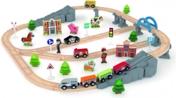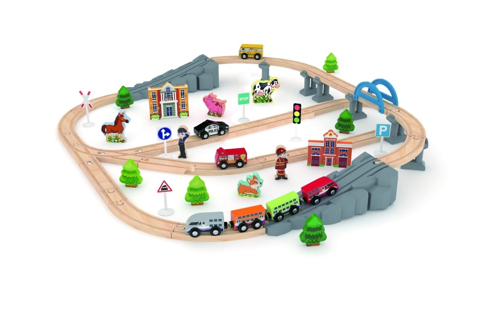 Deze houten treinbaan opent voor kinderen een wereld vol fantasie en ontdekking. Dankzij de eenvoudig te koppelen onderdelen kun je de baan snel opbouwen en naar wens variëren. De brug geeft de set een aantrekkelijk element dat elke rit bijzonder maakt en creatief bouwen stimuleert.