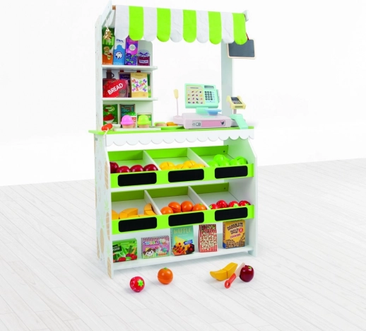 Stijlvolle houten speelset voor kleine verkopers die communicatieve vaardigheden, fijne motoriek en logisch denken ontwikkelt. Gemaakt van hoogwaardig natuurlijk hout, veilig en milieuvriendelijk. Dankzij de grotere afmetingen ideaal voor samen spelen met meerdere kinderen.