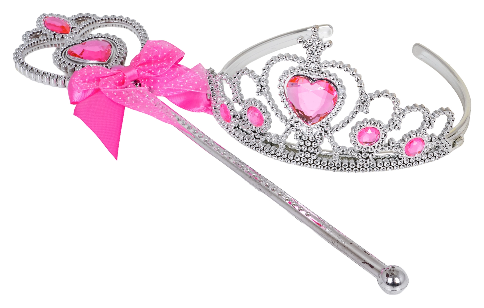 Een zilveren kroon met roze steentjes en een bijpassende toverstok geven het kostuum koninklijke glans en stimuleren de verbeelding bij rollenspel.