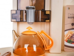 Uit de kraan stroomt echt water, terwijl de koelkast, oven, kastjes en planken alle accessoires herbergen en de speelhoek netjes houden.
