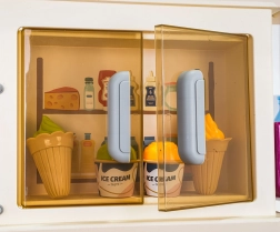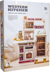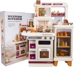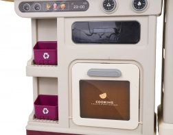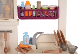 Deze multifunctionele keuken in elegante beige kleur is gemaakt van hoogwaardige, duurzame kunststof en verrast elk kind met realistische functies. De verlichte kookpitten maken kook- en bakgeluiden, uit één pit komt zachte stoom en uit de functionele kraan stroomt water. De oven en koelkast met deuren, samen met planken en haakjes, houden alle accessoires netjes op hun plek.