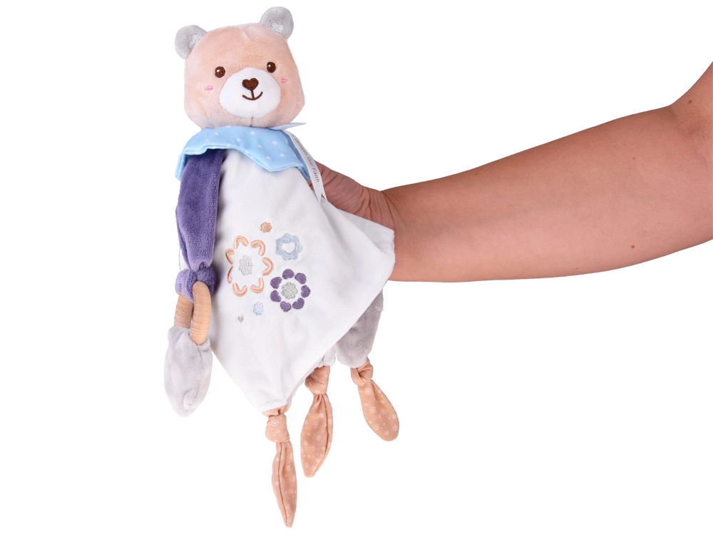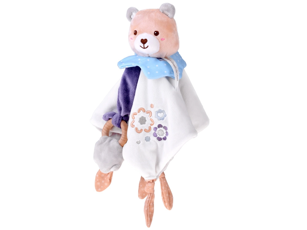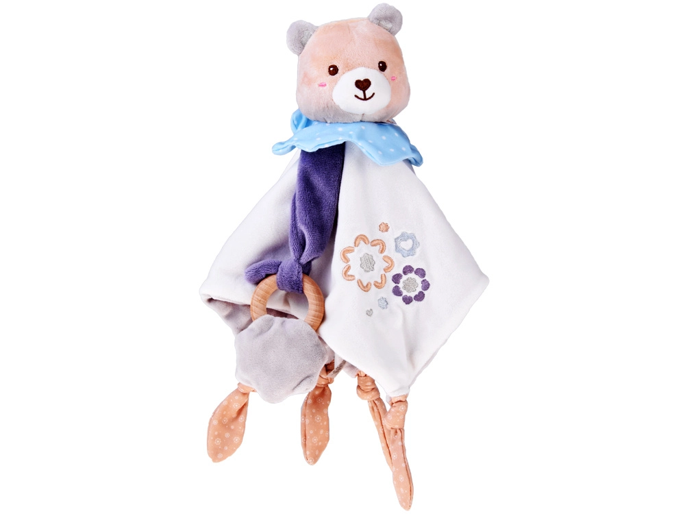 Deze schattige knuffel voor baby’s combineert een pluchen beertje, een zacht kalmerend dekentje en een houten-look bijtring in één. Biedt verschillende texturen, geborduurde details en knoopjes voor makkelijk vastpakken, die de sensomotorische ontwikkeling ondersteunen en vanaf de eerste levensdagen een gevoel van geborgenheid geven.