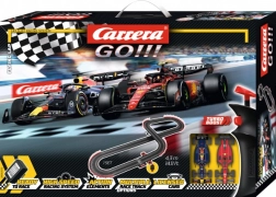 Stap de wereld van snelheid binnen met de Carrera GO!!! Flying Lap. Met afmetingen van 183 × 80 cm na montage en een slim ontworpen baan met fly-over biedt hij dynamische races tussen twee iconen van de Formule 1 – FERRARI SF-23 “C. Sainz” en RED BULL RACING RB19 “M. Verstappen”. Het analoge systeem met een mechanische rondenteller en regelaars met Turbo-functie zorgt voor opwindende gevechten wiel aan wiel.