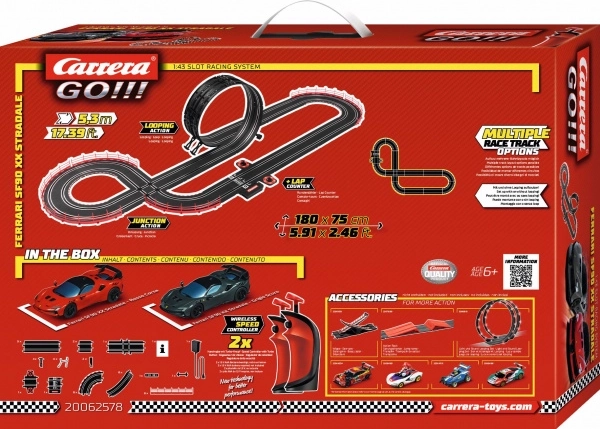 Bouw je eigen circuit en geniet van spectaculaire duels met de Carrera GO Ferrari Supercar Power. Twee exclusieve modellen Ferrari SF-90 XX Stradale in Rosso Corsa en Grigio Scuro, draadloze snelheidscontrollers en baanfeatures zoals een looping en kruising zorgen voor dynamische actie. Dankzij de schaal 1:43 en de hoogwaardige afwerking is de ervaring realistisch en soepel.