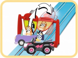 1× auto Bluey, 1× auto Bingo, rechte stukken en bochten, 2× poort, 1× voedingsdeel, 2× snelheidsregelaar, steunen, vangrails, koppelingen, decoraties, handleiding in het Tsjechisch