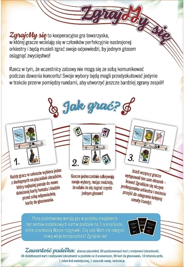 “ZgrajMy się” biedt een originele spelervaring met een muzikaal thema, waarbij spelers tijdens het “concert” niet mogen communiceren en hun strategieën alleen in de pauzes tussen de rondes afstemmen. Elke beslissing telt, en een goed op elkaar ingespeeld team geeft het gevoel van een geslaagde symfonie. Dankzij de korte speelduur en eenvoudige regels is het spel perfect als partygame en ook geschikt voor gezinnen met tieners.