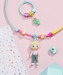 Van de poppen maak je eenvoudig een armband, ketting of hanger voor je sleutels en rugzak. Gekleurde koordjes, een ring en connectors maken van spelen een modieuze accessoire.