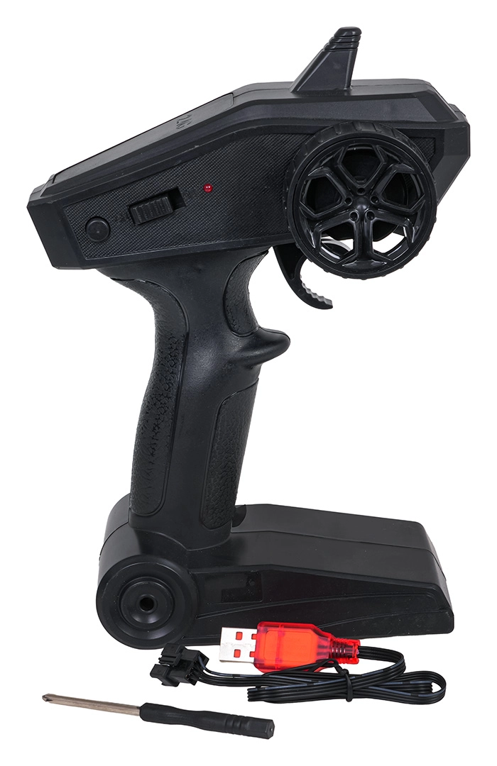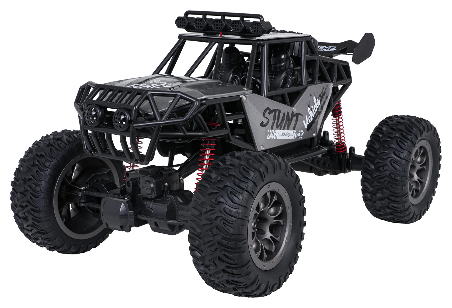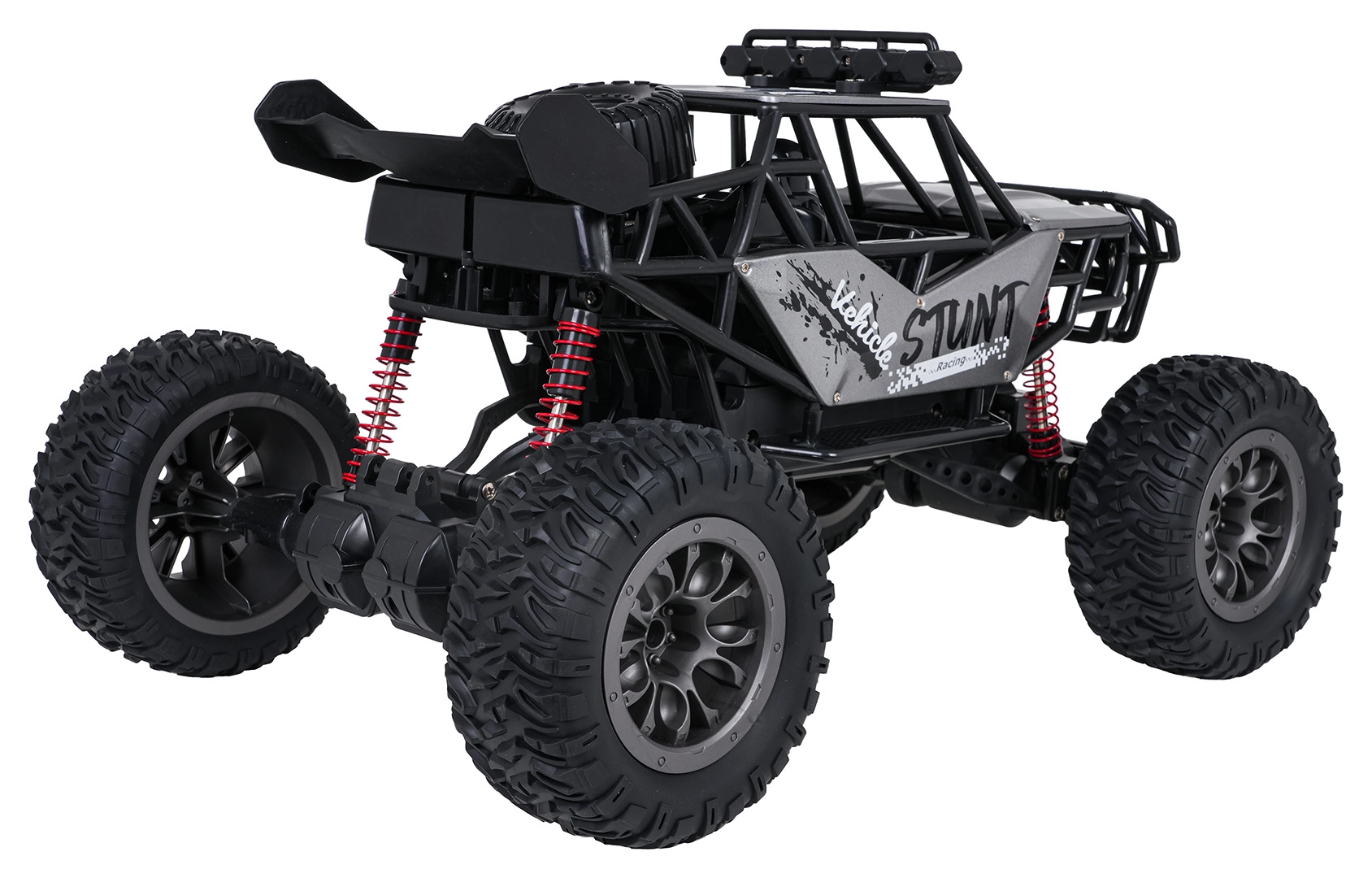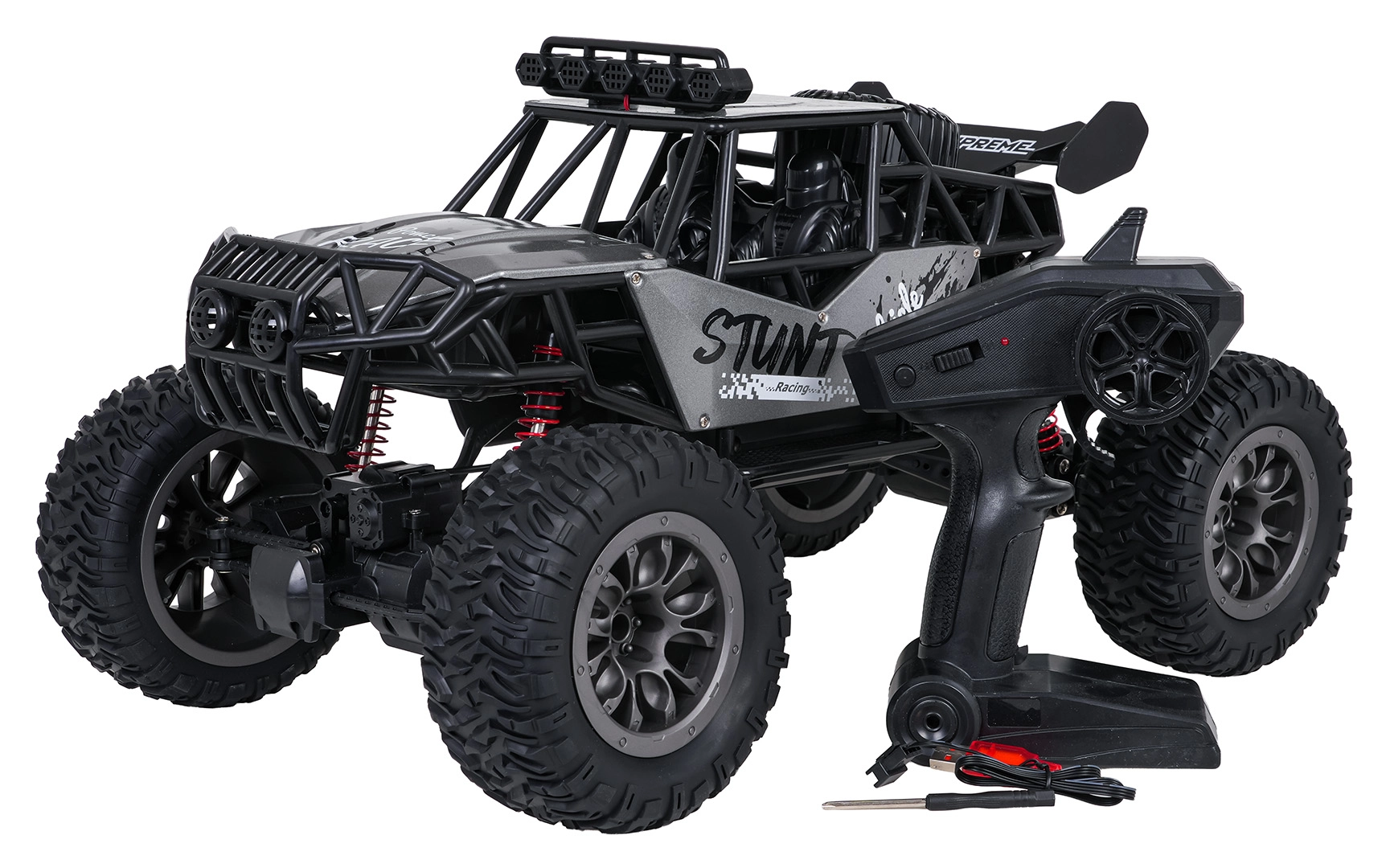 Dankzij de vierwielaandrijving 4x4, hoge bodemvrijheid en onafhankelijke veerophanging klimt het model gemakkelijk over obstakels en voert het stunttrucs uit. Koplampen en een LED-paneel op het dak verbeteren de zichtbaarheid en zorgen voor een aantrekkelijk uiterlijk. Handige voeding via een 7,4 V-accu (inbegrepen) bespaart batterijen; de controller vereist 4× AA (niet inbegrepen).