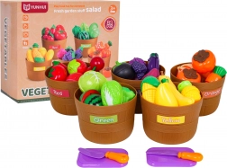 Twee messen, twee plankjes en stevige mandjes vormen een complete set die creatief spel, motoriek en kennis van voedingsmiddelen ondersteunt.