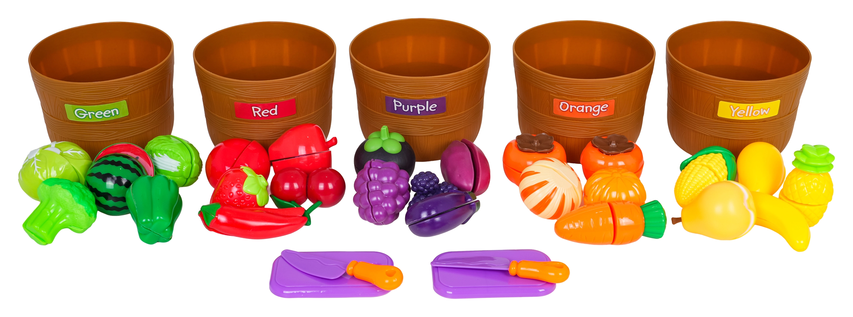 Vijf gemarkeerde mandjes (groen, rood, paars, oranje, geel) helpen kinderen fruit en groenten eenvoudig op kleur te sorteren en ontwikkelen logisch denken.