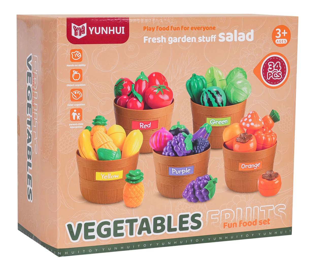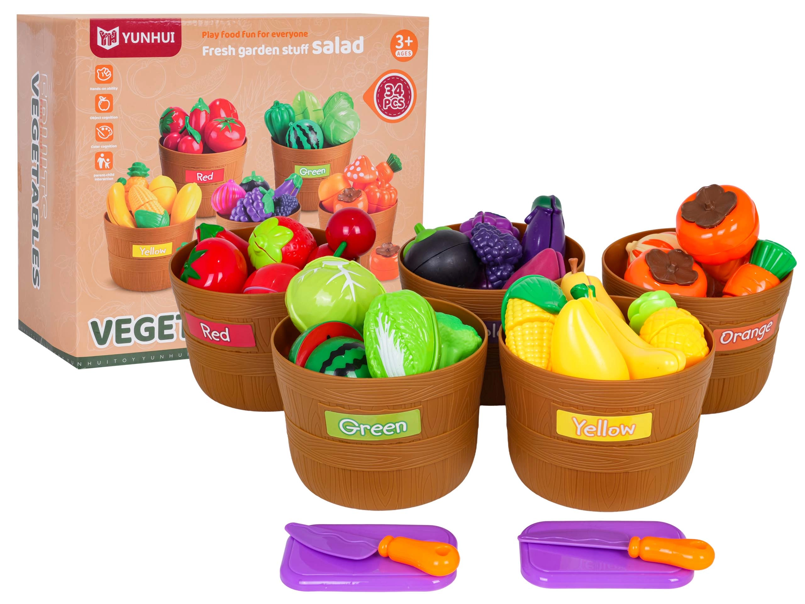 Ontdek een leuke didactische set fruit en groenten voor kinderen vanaf 3 jaar. De set bevat 34 onderdelen, waaronder fruit en groenten met klittenband om “te snijden”, 5 mandjes om op kleur te sorteren en 2 snijplankjes met messen. Hoogwaardige kunststof in levendige kleuren stimuleert de fijne motoriek, leert kleuren en ondersteunt creatief rollenspel in de keuken.