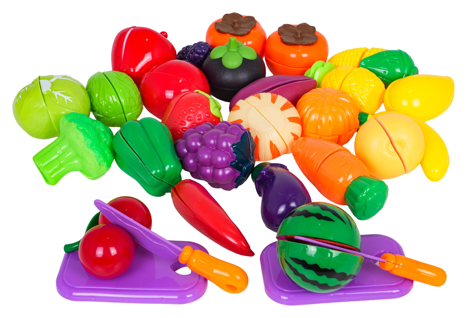 - Realistische stukken: banaan, citroen, maïs, ananas, tomaat, aardbei, wortel, aubergine, sla, paprika en meer
