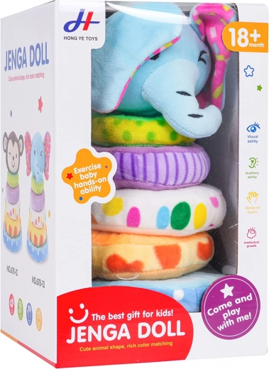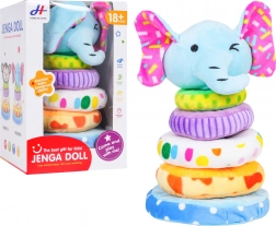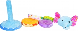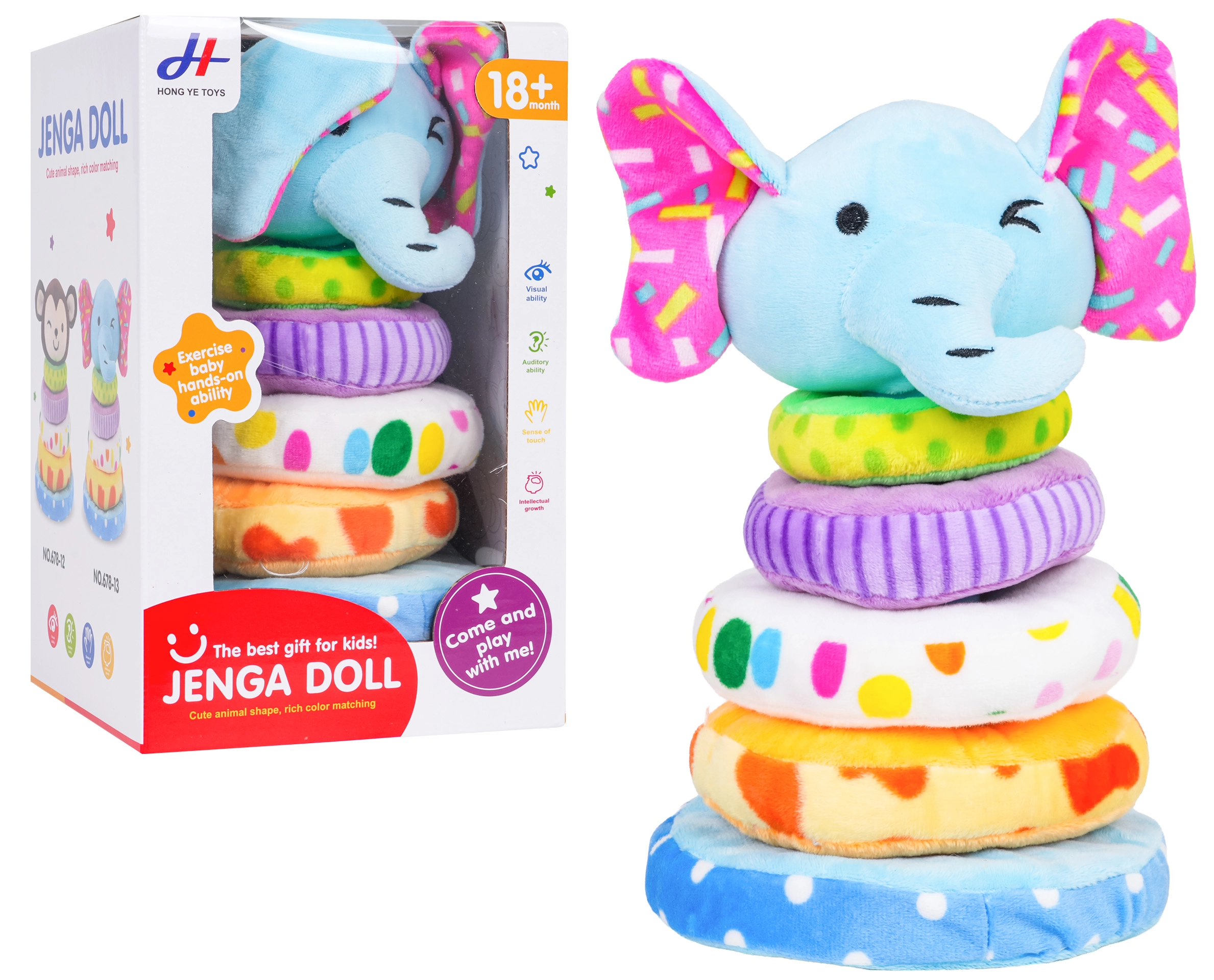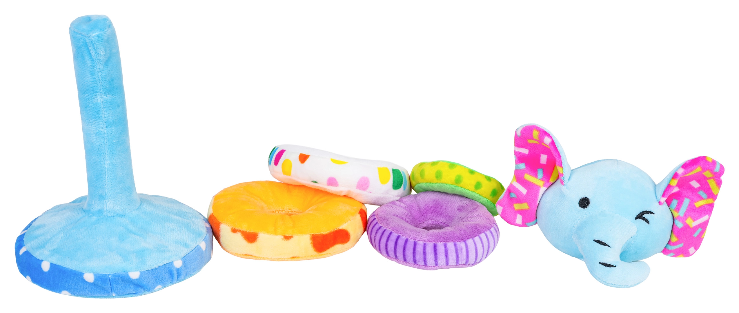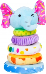 Deze zachte pluche piramide in de vorm van een olifant is een geweldig eerste educatief speeltje. Kinderen oefenen met het rijgen van 4 ringen van verschillende groottes op een zachte pin en leren sorteren op grootte en kleur. Het piepje in de olifantenkop beloont elke druk met een vrolijk geluid en stimuleert het gehoor.
