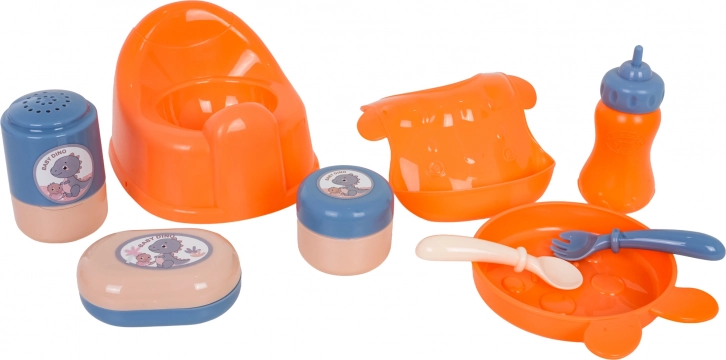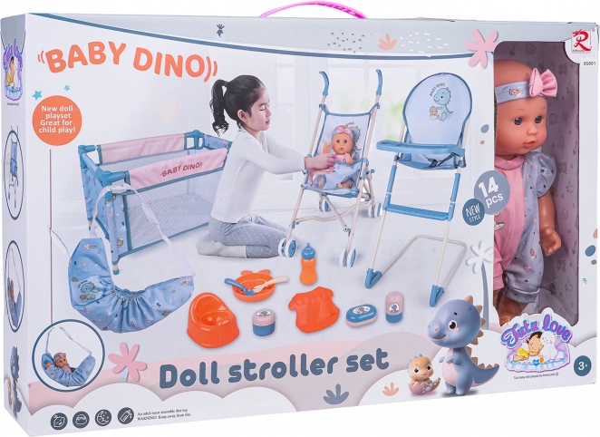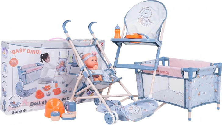 Ontdek een rijk uitgeruste speelset voor vadertje- en moedertje-spel met de schattige BABY DINO-pop en 14 stuks accessoires. De set bevat een buggy, kinderstoel, reisbedje, potje, fles en voedingsaccessoires. Dankzij de veilige materialen, levendige kleuren en de mogelijkheid om de pop te laten drinken en zindelijk te leren worden op het potje is de set ideaal voor kinderen vanaf 3 jaar.