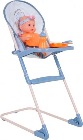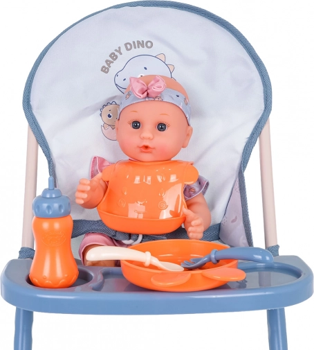 Comfortabel voeden van de pop dankzij de hoge kinderstoel met afneembaar blad en een set bestek, bordje, slab en flesje. Ideaal voor realistische zorgscenario’s.